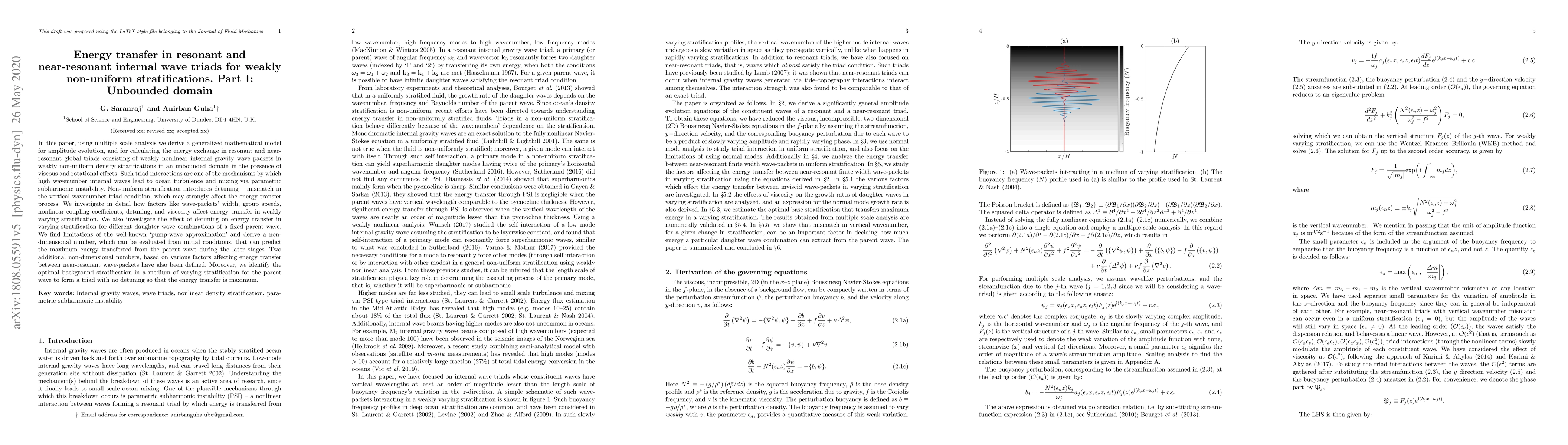 This paper develops a generalized mathematical model for energy transfer in resonant and near-resonant internal wave triads in weakly non-uniform stratifications, using multiple scale analysis. It identifies factors affecting energy transfer and defines non-dimensional numbers that predict maximum energy transfer, highlighting the impact of background stratification variations.