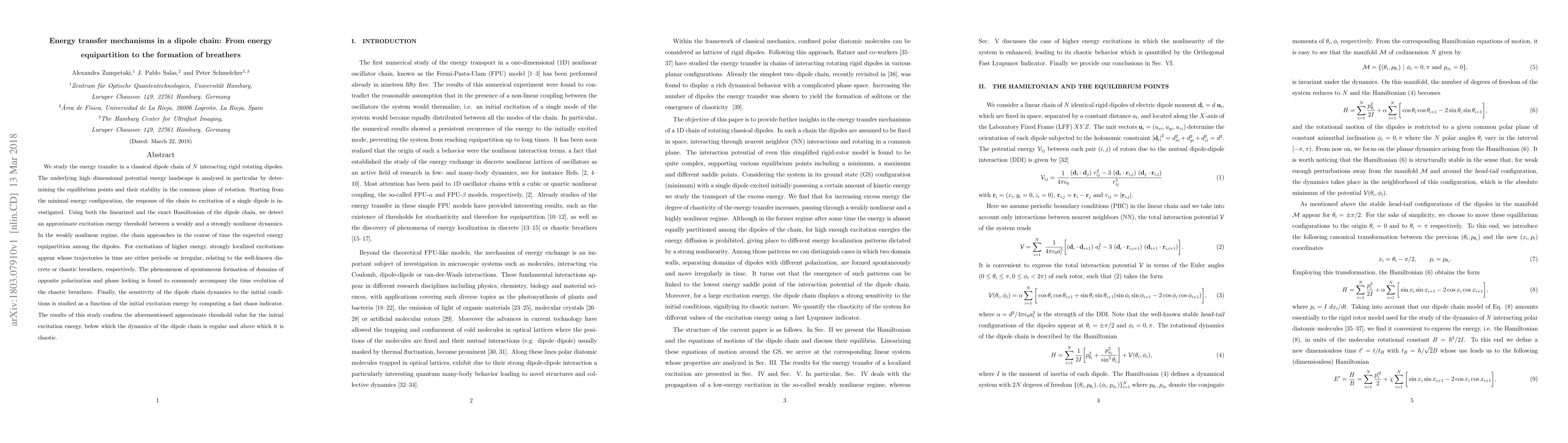This paper investigates energy transfer in a dipole chain, revealing an energy threshold that distinguishes weakly nonlinear dynamics leading to energy equipartition from strongly nonlinear dynamics forming breathers. The study shows that chaotic breathers often develop domains of opposite polarization and phase locking.