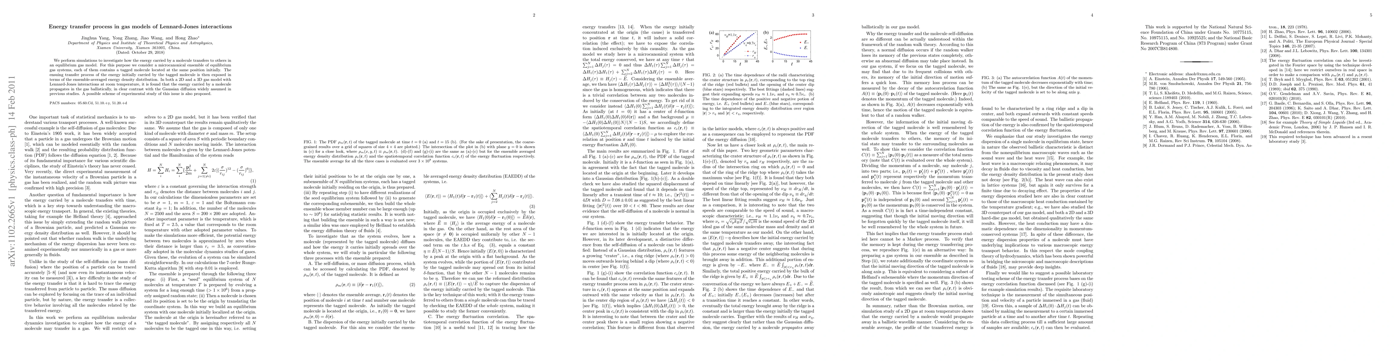 We perform simulations to investigate how the energy carried by a molecule transfers to others in an equilibrium gas model. For this purpose we consider a microcanonical ensemble of equilibrium gas systems, each of them contains a tagged molecule located at the same position initially. The ensuing transfer process of the energy initially carried by the tagged molecule is then exposed in terms of the ensemble-averaged energy density distribution. In both a 2D and a 3D gas model with Lennard-Jones interactions at room temperature, it is found that the energy carried by a molecule propagates in the gas ballistically, in clear contrast with the Gaussian diffusion widely assumed in previous studies. A possible scheme of experimental study of this issue is also proposed