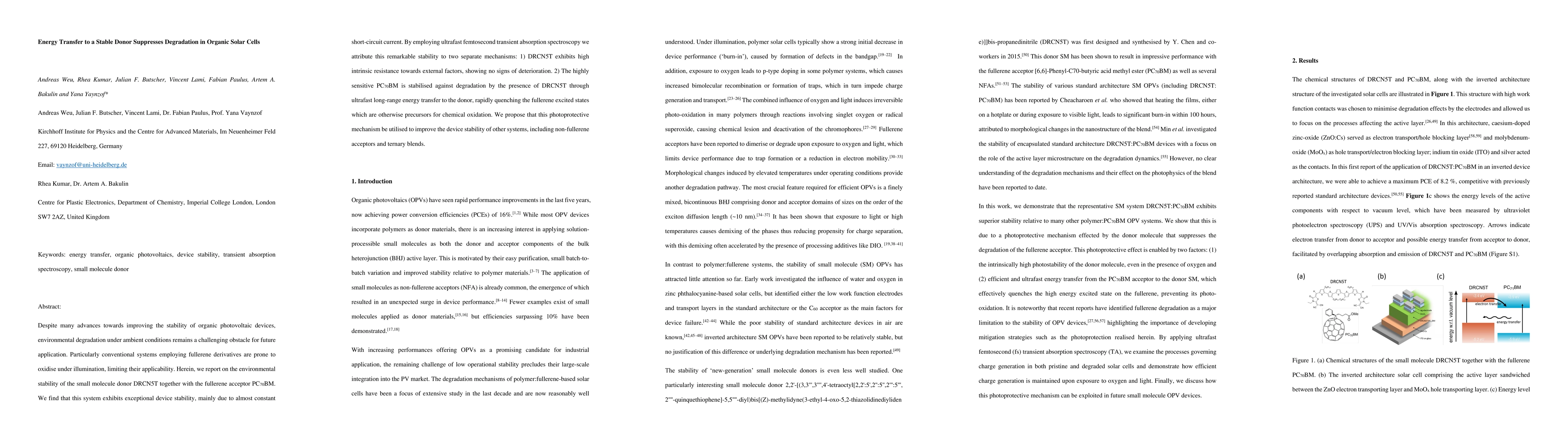Despite many advances towards improving the stability of organic photovoltaic devices, environmental degradation under ambient conditions remains a challenging obstacle for future application. Particularly conventional systems employing fullerene derivatives are prone to oxidise under illumination, limiting their applicability. Herein, we report on the environmental stability of the small molecule donor DRCN5T together with the fullerene acceptor PC70BM. We find that this system exhibits exceptional device stability, mainly due to almost constant short-circuit current. By employing ultrafast femtosecond transient absorption spectroscopy we attribute this remarkable stability to two separate mechanisms: 1) DRCN5T exhibits high intrinsic resistance towards external factors, showing no signs of deterioration. 2) The highly sensitive PC70BM is stabilised against degradation by the presence of DRCN5T through ultrafast long-range energy transfer to the donor, rapidly quenching the fullerene excited states which are otherwise precursors for chemical oxidation. We propose that this photoprotective mechanism be utilised to improve the device stability of other systems, including non-fullerene acceptors and ternary blends.