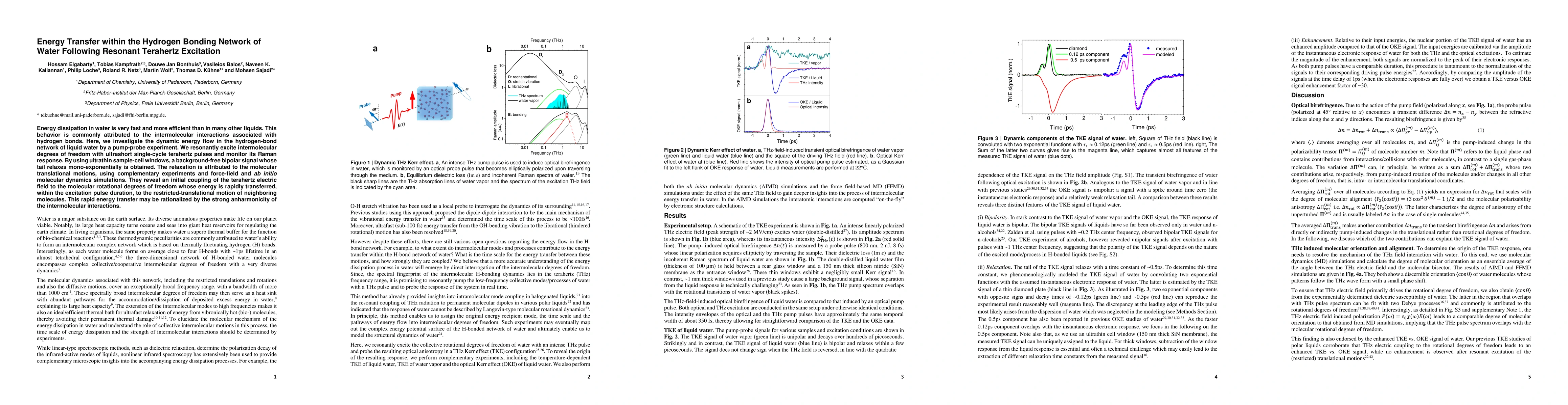 This study investigates the rapid energy transfer dynamics within water's hydrogen bonding network using resonant terahertz excitation and pump-probe experiments. The results show that energy quickly moves from molecular rotations to translational motions, facilitated by the strong anharmonicity of intermolecular interactions.