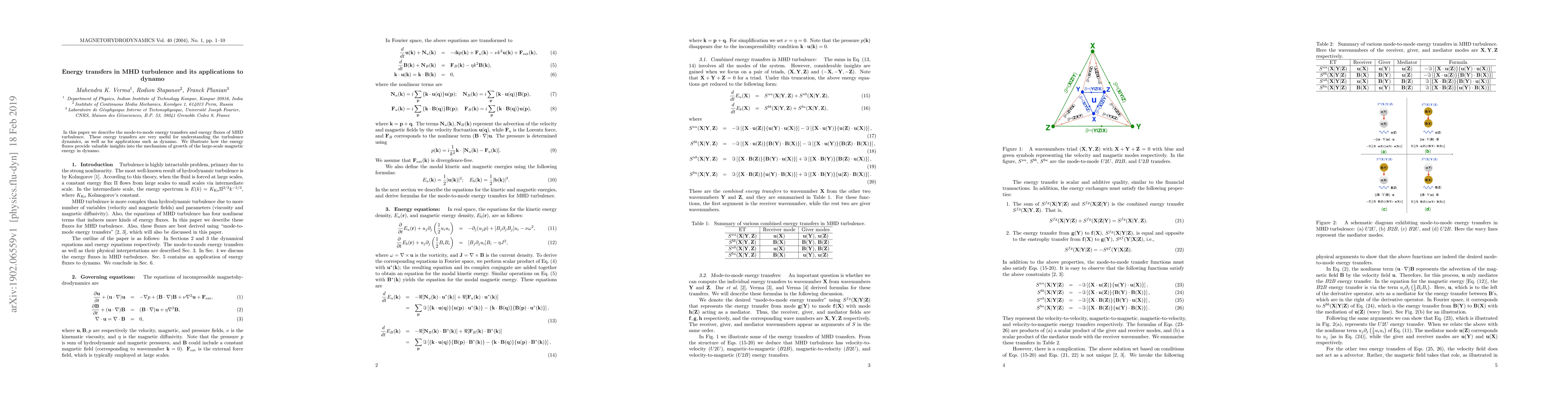 In this paper we describe the mode-to-mode energy transfers and energy fluxes of MHD turbulence. These energy transfers are very useful for understanding the turbulence dynamics, as well as for applications such as dynamo. We illustrate how the energy fluxes provide valuable insights into the mechanism of growth of the large-scale magnetic energy in dynamo.