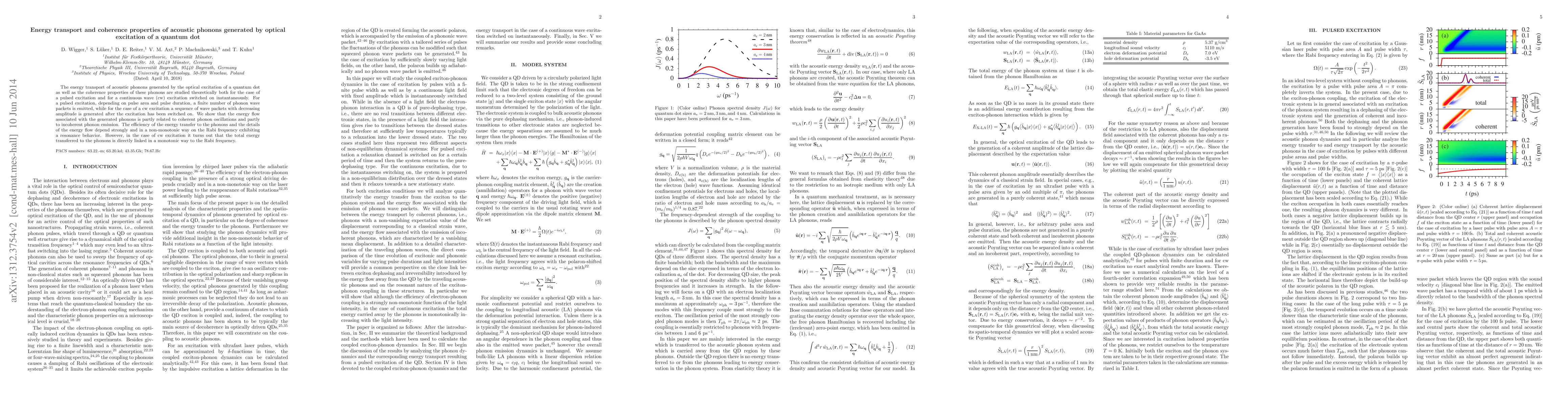 This research investigates the energy transport and coherence of acoustic phonons produced by optical excitation of quantum dots. It reveals that phonon emission depends on pulse area and duration for pulsed excitation, generating a finite number of wave packets. For continuous wave excitation, a sequence of decreasing amplitude wave packets is produced. The energy transfer efficiency to phonons is shown to have a non-monotonic relationship with Rabi frequency, exhibiting resonance behavior, except for continuous wave excitation where it increases monotonically with Rabi frequency.