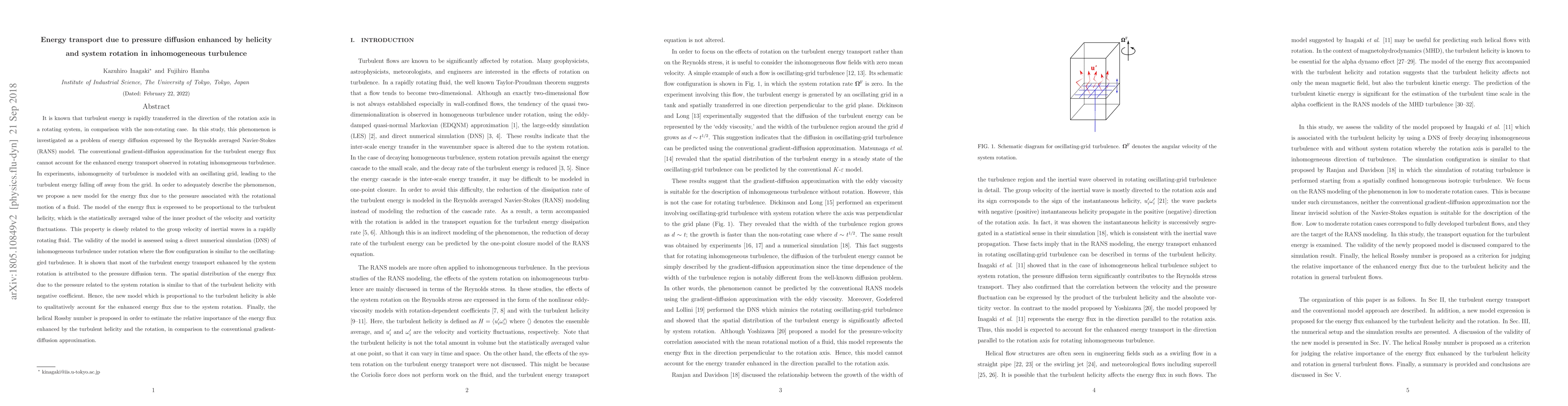 It is known that turbulent energy is rapidly transferred in the direction of the rotation axis in a rotating system, in comparison with the non-rotating case. In this study, this phenomenon is investigated as a problem of energy diffusion expressed by the Reynolds averaged Navier-Stokes (RANS) model. The conventional gradient-diffusion approximation for the turbulent energy flux cannot account for the enhanced energy transport observed in rotating inhomogeneous turbulence. In order to adequately describe the phenomenon, we propose a new model for the energy flux due to the pressure associated with the rotational motion of a fluid. The model of the energy flux is expressed to be proportional to the turbulent helicity. This property is closely related to the group velocity of inertial waves in a rapidly rotating fluid. The validity of the model is assessed using a direct numerical simulation (DNS) of inhomogeneous turbulence under rotation. It is shown that most of the turbulent energy transport enhanced by the system rotation is attributed to the pressure diffusion term. The spatial distribution of the energy flux due to the pressure related to the system rotation is similar to that of the turbulent helicity with negative coefficient. Hence, the new model which is proportional to the turbulent helicity is able to qualitatively account for the enhanced energy flux due to the system rotation. Finally, the helical Rossby number is proposed in order to estimate the relative importance of the energy flux enhanced by the turbulent helicity and the rotation, in comparison to the conventional gradient-diffusion approximation.