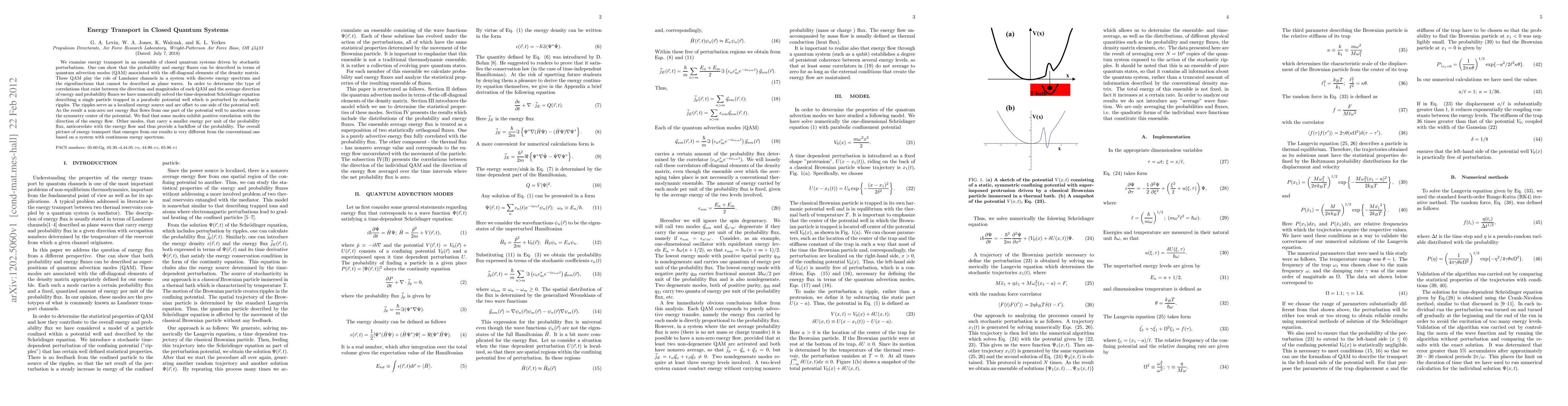 This research explores energy transport in closed quantum systems under stochastic perturbations, identifying quantum advection modes (QAM) as key to describing probability and energy fluxes. Numerical solutions of a time-dependent Schrödinger equation for a single particle in a parabolic potential, perturbed by localized 'ripples', reveal distinct QAM correlations with energy and probability flux directions. The findings contrast conventional energy transport models based on continuous energy spectra.