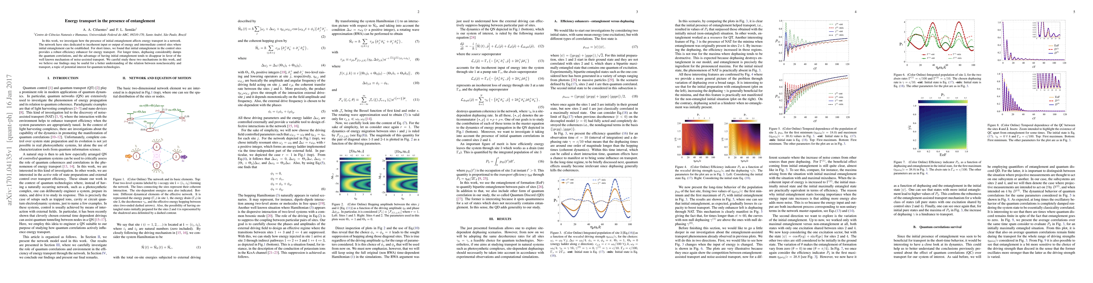 In this work, we investigate how the presence of initial entanglement affects energy transport in a network. The network have sites dedicated to incoherent input or output of energy and intermediate control sites where initial entanglement can be established. For short times, we found that initial entanglement in the control sites provides a robust efficiency enhancer for energy transport. For longer times, dephasing considerably damps the quantum correlations, and the advantage of having initial entanglement tends to disappear in favor of the well known mechanism of noise-assisted transport. We careful study these two mechanisms in this work, and we believe our findings may be usuful for a better understanding of the relation between nonclassicality and transport, a topic of potential interest for quantum technologies.