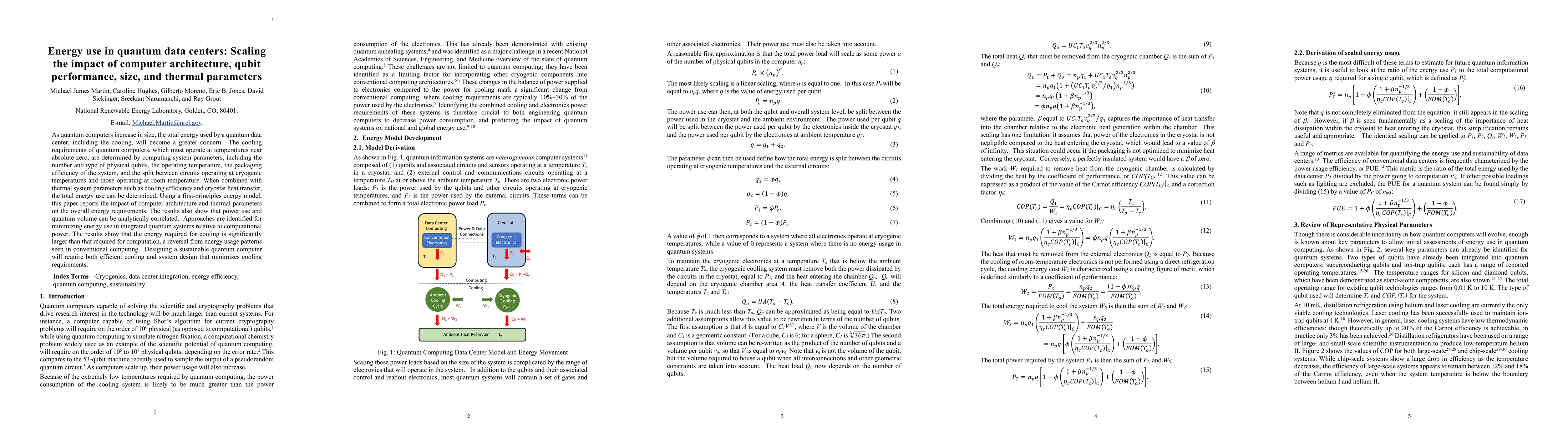 This research examines the energy consumption in quantum data centers, highlighting that cooling, due to qubits' near-absolute-zero operation, significantly impacts total energy use. The study uses a first-principles energy model to show that system design and cooling efficiency are crucial for minimizing energy use, with cooling consuming more energy than computation.