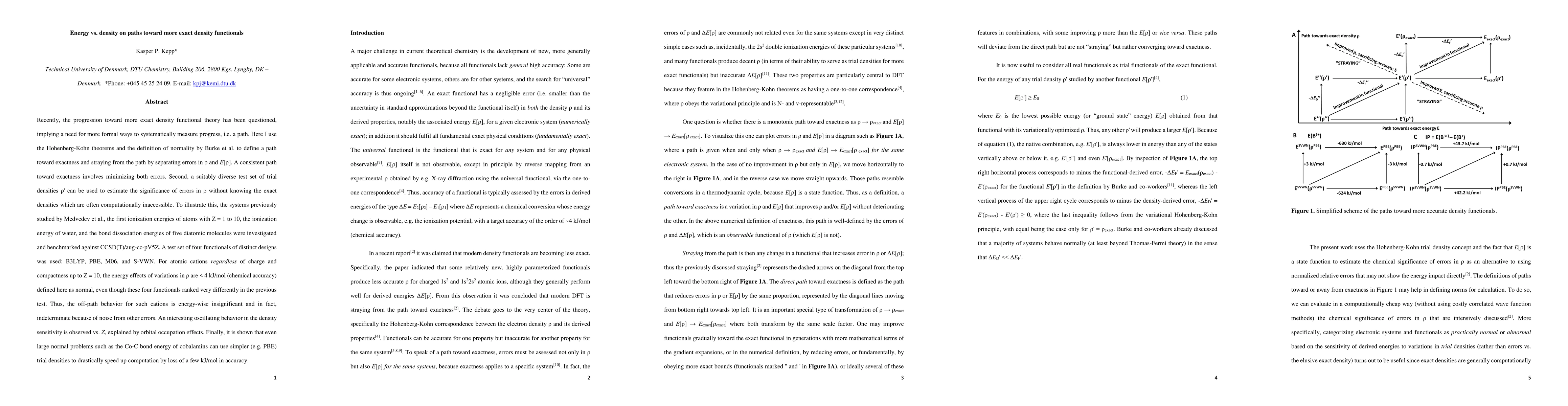 Recently, the progression toward more exact density functional theory has been questioned, implying a need for more formal ways to systematically measure progress, i.e. a path. Here I use the Hohenberg-Kohn theorems and the definition of normality by Burke et al. to define a path toward exactness and straying from the path by separating errors in \r{ho} and E[\r{ho}]. A consistent path toward exactness involves minimizing both errors. Second, a suitably diverse test set of trial densities \r{ho}' can be used to estimate the significance of errors in \r{ho} without knowing the exact densities which are often computationally inaccessible. To illustrate this, the systems previously studied by Medvedev et al., the first ionization energies of atoms with Z = 1 to 10, the ionization energy of water, and the bond dissociation energies of five diatomic molecules were investigated and benchmarked against CCSD(T)/aug-cc-pV5Z. A test set of four functionals of distinct designs was used: B3LYP, PBE, M06, and S-VWN. For atomic cations regardless of charge and compactness up to Z = 10, the energy effects of variations in \r{ho} are < 4 kJ/mol (chemical accuracy) defined here as normal, even though these four functionals ranked very differently in the previous test. Thus, the off-path behavior for such cations is energy-wise insignificant and in fact, indeterminate because of noise from other errors. An interesting oscillating behavior in the density sensitivity is observed vs. Z, explained by orbital occupation effects. Finally, it is shown that even large normal problems such as the Co-C bond energy of cobalamins can use simpler (e.g. PBE) trial densities to drastically speed up computation by loss of a few kJ/mol in accuracy.