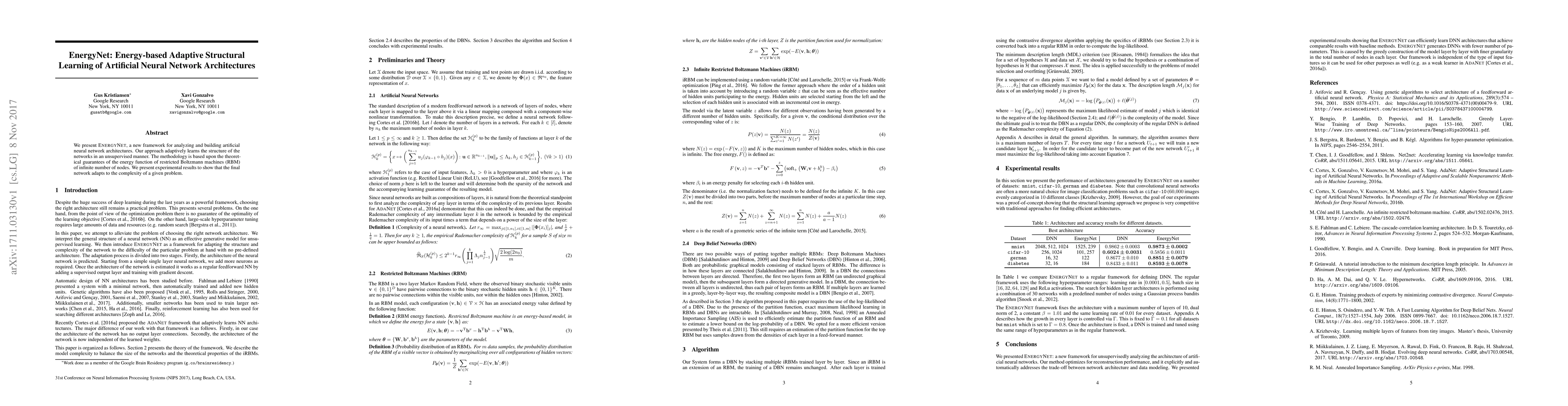 Summary: ENERGYNET adaptively learns neural network architectures in an unsupervised manner, leveraging the energy function of infinite restricted Boltzmann machines. Experimental results demonstrate that the framework effectively tailors network complexity to specific problems.
