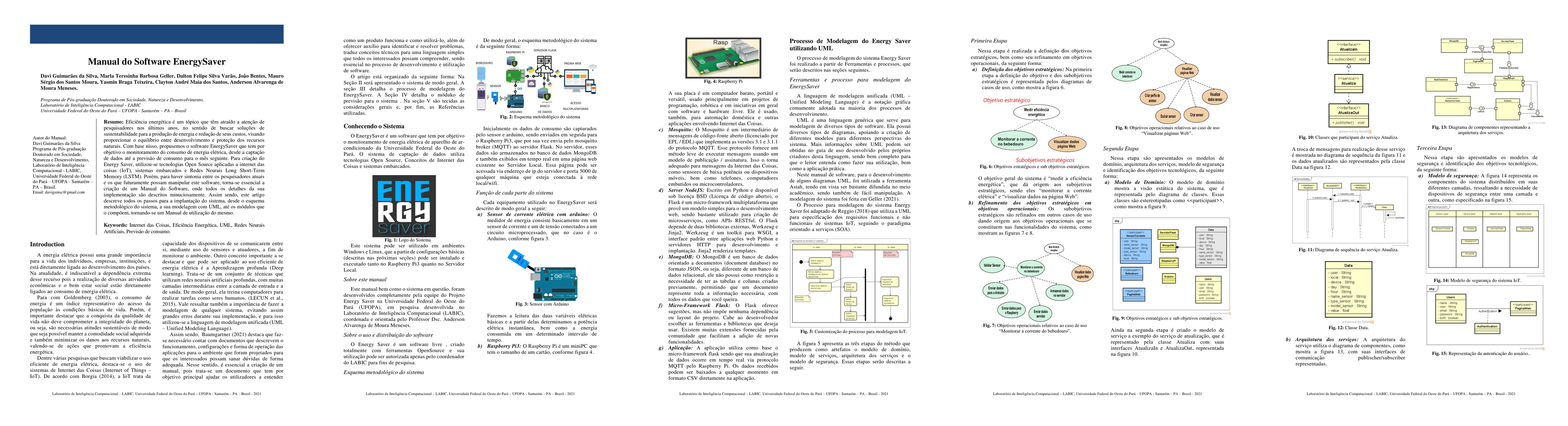Energy efficiency is a topic that has attracted the attention of researchers in recent years, in order to seek sustainability solutions for energy production and reduction of its costs, aiming to provide a balance between development and protection of natural resources. Thus, we proposed the EnergySaver software that has as its objective the monitoring of electric energy consumption, from data capture to consumption forecast for the following month. To create Energy Saver, we used Open Source technologies applied to the Internet of Things (IoT), embedded systems, and Long Short-Term Memory Neural Networks (LSTM). However, in order to have harmony between the current researchers and those who may manipulate this software in the future, it is essential to create a Software Manual, where all the details of its implementation are described in detail. Therefore, this article describes all the steps for the implementation of the system, from the methodological scheme of the system, its modeling with UML, to the modules that compose it, becoming a Manual for its use.