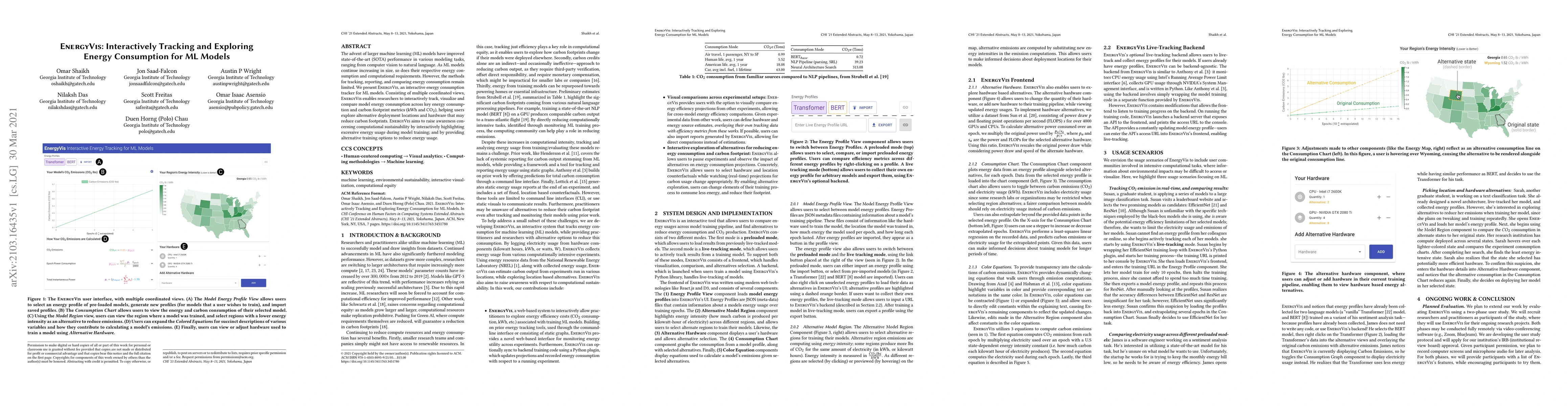 The advent of larger machine learning (ML) models have improved state-of-the-art (SOTA) performance in various modeling tasks, ranging from computer vision to natural language. As ML models continue increasing in size, so does their respective energy consumption and computational requirements. However, the methods for tracking, reporting, and comparing energy consumption remain limited. We presentEnergyVis, an interactive energy consumption tracker for ML models. Consisting of multiple coordinated views, EnergyVis enables researchers to interactively track, visualize and compare model energy consumption across key energy consumption and carbon footprint metrics (kWh and CO2), helping users explore alternative deployment locations and hardware that may reduce carbon footprints. EnergyVis aims to raise awareness concerning computational sustainability by interactively highlighting excessive energy usage during model training; and by providing alternative training options to reduce energy usage.