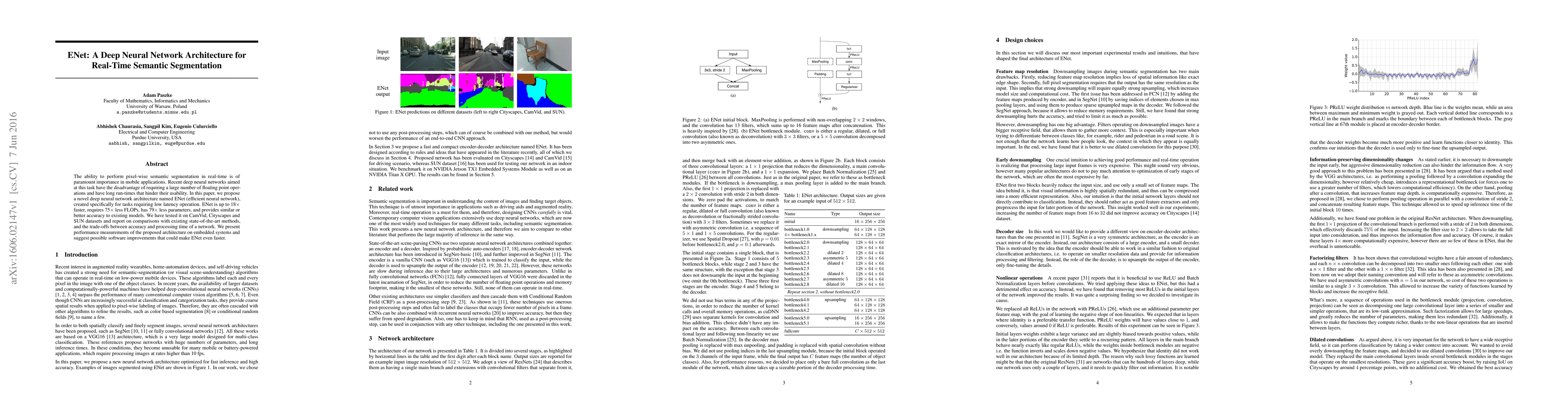 Researchers developed ENet, a deep neural network that achieves real-time semantic segmentation with 75% less FLOPs and 79% fewer parameters than existing models, offering improved performance at reduced latency.