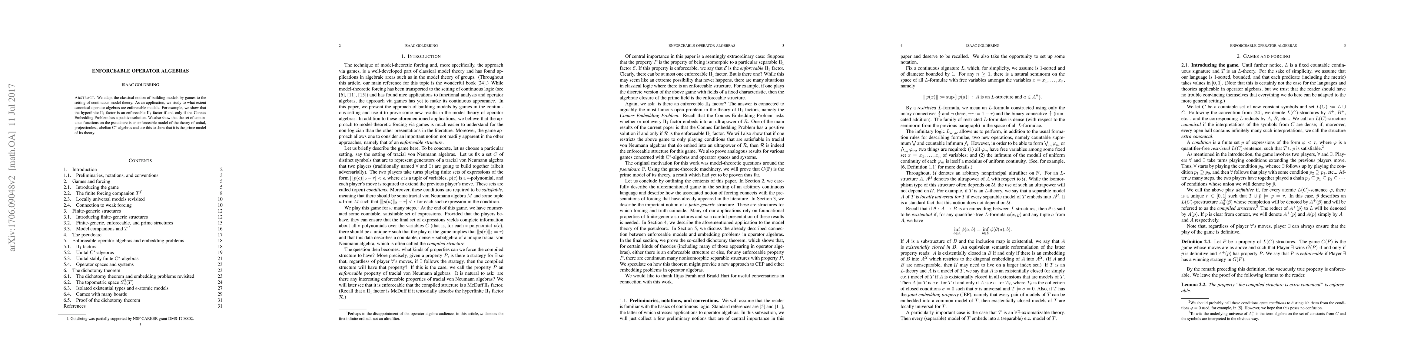 We adapt the classical notion of building models by games to the setting of continuous model theory. As an application, we study to what extent canonical operator algebras are enforceable models. For example, we show that the hyperfinite II$_1$ factor is an enforceable II$_1$ factor if and only if the Connes Embedding Problem has a positive solution. We also show that the set of continuous functions on the pseudoarc is an enforceable model of the theory of unital, projectionless, abelian \cstar-algebras and use this to show that it is the prime model of its theory.