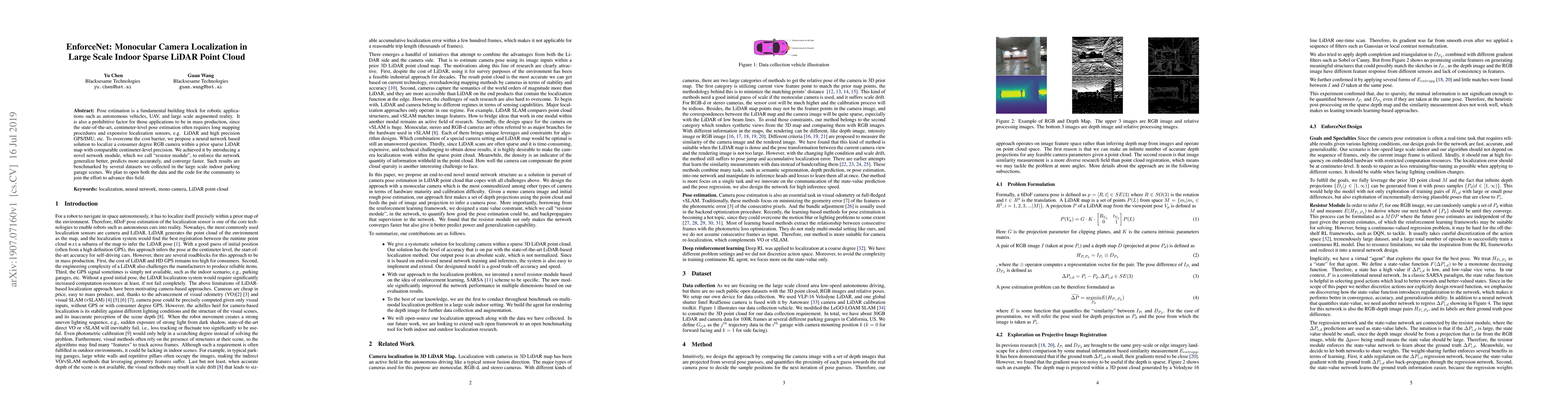 Pose estimation is a fundamental building block for robotic applications such as autonomous vehicles, UAV, and large scale augmented reality. It is also a prohibitive factor for those applications to be in mass production, since the state-of-the-art, centimeter-level pose estimation often requires long mapping procedures and expensive localization sensors, e.g. LiDAR and high precision GPS/IMU, etc. To overcome the cost barrier, we propose a neural network based solution to localize a consumer degree RGB camera within a prior sparse LiDAR map with comparable centimeter-level precision. We achieved it by introducing a novel network module, which we call resistor module, to enforce the network generalize better, predicts more accurately, and converge faster. Such results are benchmarked by several datasets we collected in the large scale indoor parking garage scenes. We plan to open both the data and the code for the community to join the effort to advance this field.