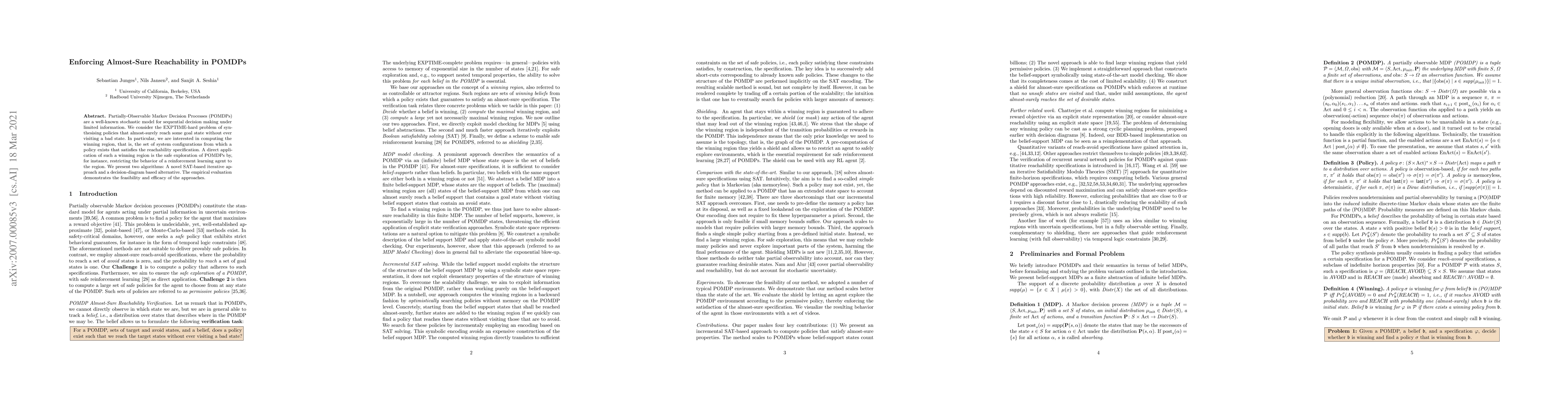 The research presents two algorithms: a SAT-based iterative approach and a decision-diagram based alternative, to enforce almost-sure reachability in POMDPs by computing the winning region, which is the set of system configurations from which a policy exists that satisfies the reachability specification.