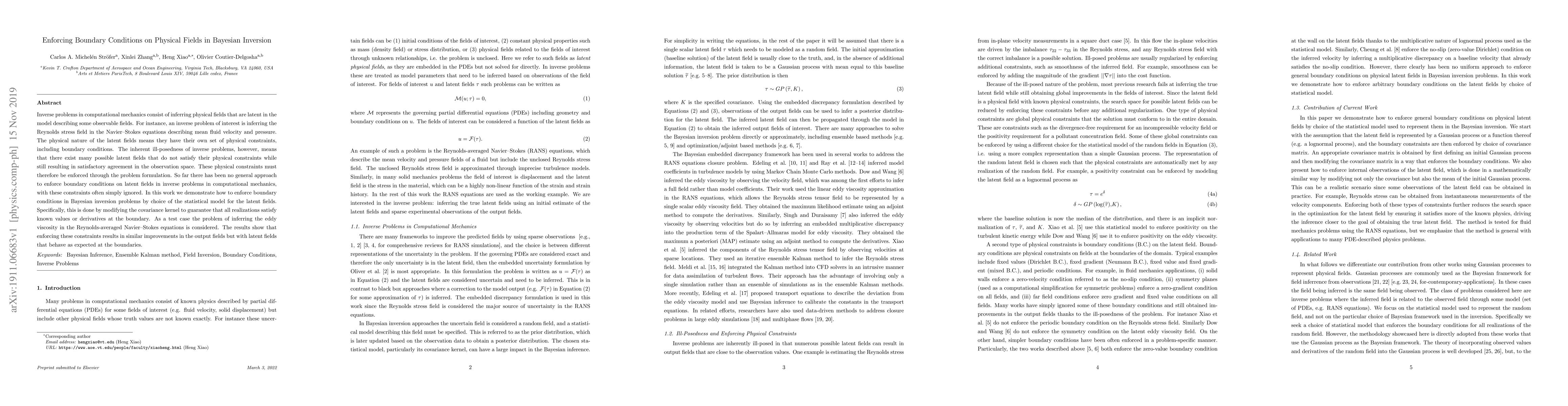 Inverse problems in computational mechanics consist of inferring physical fields that are latent in the model describing some observable fields. For instance, an inverse problem of interest is inferring the Reynolds stress field in the Navier--Stokes equations describing mean fluid velocity and pressure. The physical nature of the latent fields means they have their own set of physical constraints, including boundary conditions. The inherent ill-posedness of inverse problems, however, means that there exist many possible latent fields that do not satisfy their physical constraints while still resulting in a satisfactory agreement in the observation space. These physical constraints must therefore be enforced through the problem formulation. So far there has been no general approach to enforce boundary conditions on latent fields in inverse problems in computational mechanics, with these constraints often simply ignored. In this work we demonstrate how to enforce boundary conditions in Bayesian inversion problems by choice of the statistical model for the latent fields. Specifically, this is done by modifying the covariance kernel to guarantee that all realizations satisfy known values or derivatives at the boundary. As a test case the problem of inferring the eddy viscosity in the Reynolds-averaged Navier--Stokes equations is considered. The results show that enforcing these constraints results in similar improvements in the output fields but with latent fields that behave as expected at the boundaries.