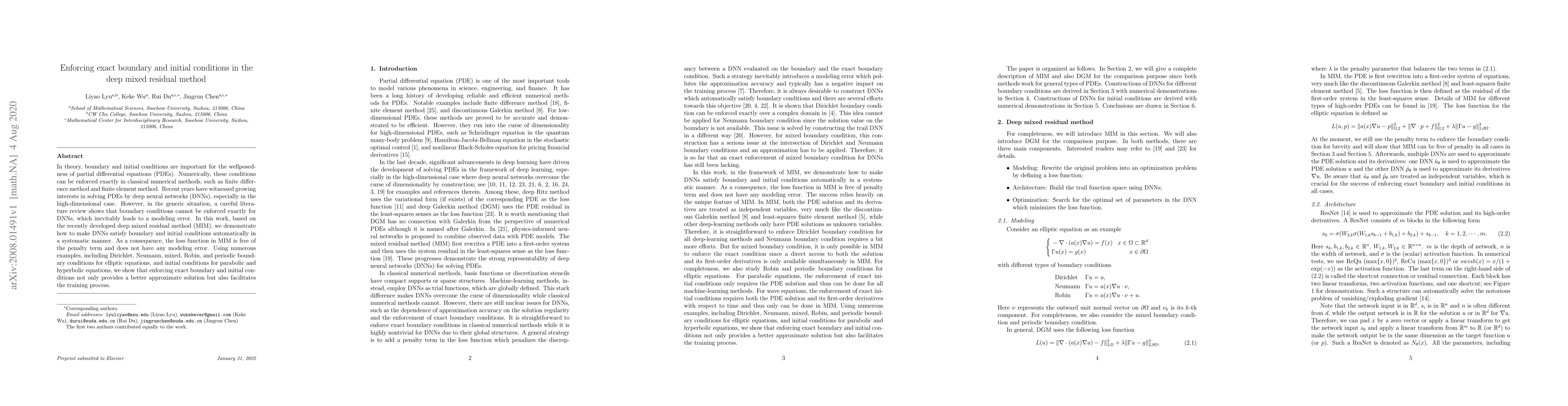 This paper proposes a method to enforce exact boundary and initial conditions in the deep mixed residual method (MIM) for solving PDEs using DNNs, eliminating modeling errors. The approach improves the approximate solution quality and enhances the training process, demonstrated through various boundary and initial conditions examples.