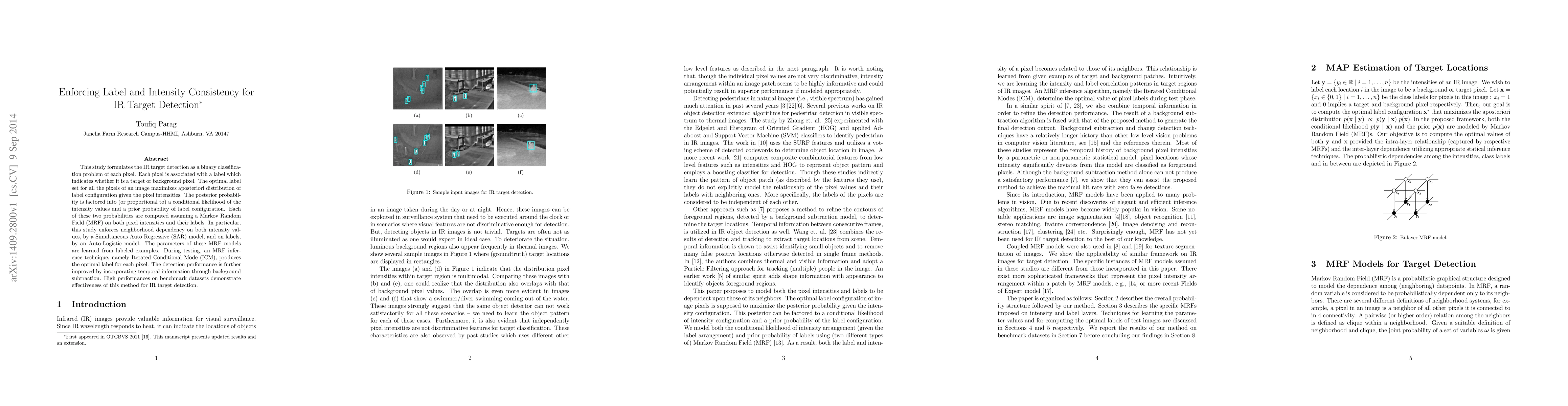 This study formulates the IR target detection as a binary classification problem of each pixel. Each pixel is associated with a label which indicates whether it is a target or background pixel. The optimal label set for all the pixels of an image maximizes aposteriori distribution of label configuration given the pixel intensities. The posterior probability is factored into (or proportional to) a conditional likelihood of the intensity values and a prior probability of label configuration. Each of these two probabilities are computed assuming a Markov Random Field (MRF) on both pixel intensities and their labels. In particular, this study enforces neighborhood dependency on both intensity values, by a Simultaneous Auto Regressive (SAR) model, and on labels, by an Auto-Logistic model. The parameters of these MRF models are learned from labeled examples. During testing, an MRF inference technique, namely Iterated Conditional Mode (ICM), produces the optimal label for each pixel. The detection performance is further improved by incorporating temporal information through background subtraction. High performances on benchmark datasets demonstrate effectiveness of this method for IR target detection.
