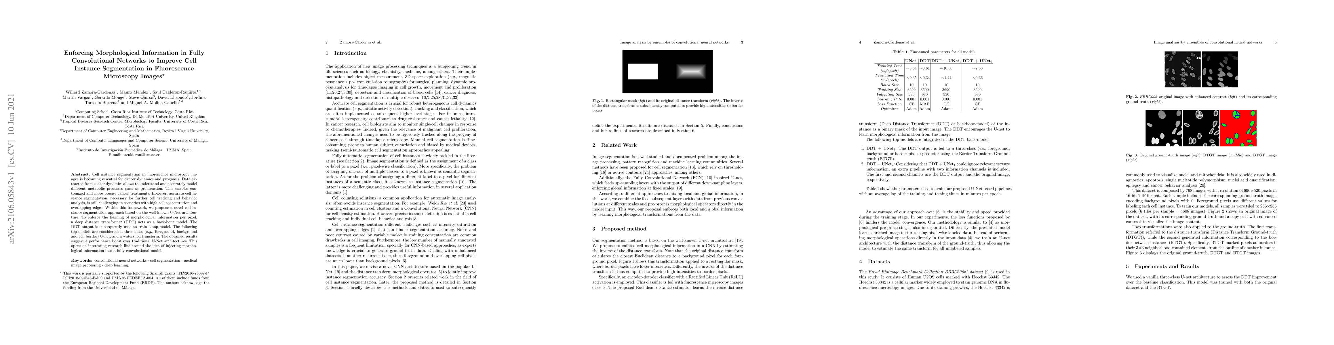 Cell instance segmentation in fluorescence microscopy images is becoming essential for cancer dynamics and prognosis. Data extracted from cancer dynamics allows to understand and accurately model different metabolic processes such as proliferation. This enables customized and more precise cancer treatments. However, accurate cell instance segmentation, necessary for further cell tracking and behavior analysis, is still challenging in scenarios with high cell concentration and overlapping edges. Within this framework, we propose a novel cell instance segmentation approach based on the well-known U-Net architecture. To enforce the learning of morphological information per pixel, a deep distance transformer (DDT) acts as a back-bone model. The DDT output is subsequently used to train a top-model. The following top-models are considered: a three-class (\emph{e.g.,} foreground, background and cell border) U-net, and a watershed transform. The obtained results suggest a performance boost over traditional U-Net architectures. This opens an interesting research line around the idea of injecting morphological information into a fully convolutional model.