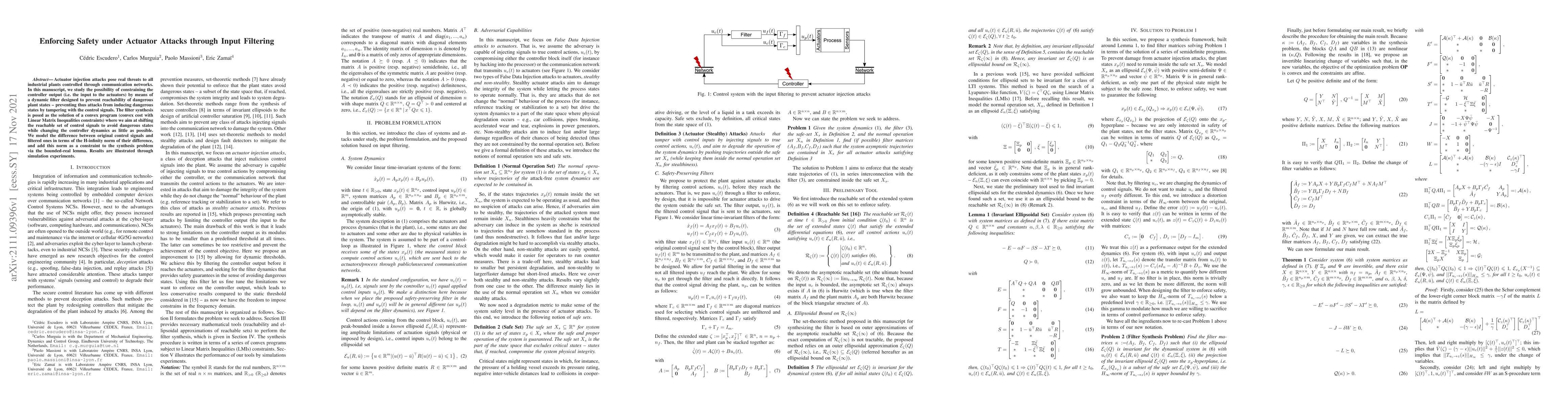 Actuator injection attacks pose real threats to all industrial plants controlled through communication networks. In this manuscript, we study the possibility of constraining the controller output (i.e. the input to the actuators) by means of a dynamic filter designed to prevent reachability of dangerous plant states - preventing thus attacks from inducing dangerous states by tampering with the control signals. The filter synthesis is posed as the solution of a convex program (convex cost with Linear Matrix Inequalities constraints) where we aim at shifting the reachable set of control signals to avoid dangerous states while changing the controller dynamics as little as possible. We model the difference between original control signals and filtered ones in terms of the H-infinity norm of their difference, and add this norm as a constraint to the synthesis problem via the bounded-real lemma. Results are illustrated through simulation experiments.