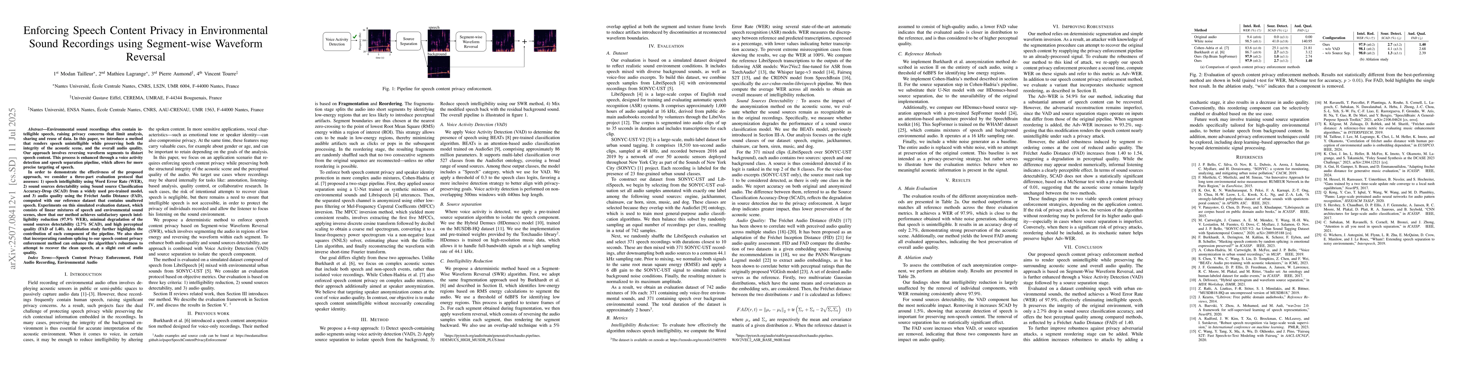 Environmental sound recordings often contain intelligible speech, raising privacy concerns that limit analysis, sharing and reuse of data. In this paper, we introduce a method that renders speech unintelligible while preserving both the integrity of the acoustic scene, and the overall audio quality. Our approach involves reversing waveform segments to distort speech content. This process is enhanced through a voice activity detection and speech separation pipeline, which allows for more precise targeting of speech. In order to demonstrate the effectivness of the proposed approach, we consider a three-part evaluation protocol that assesses: 1) speech intelligibility using Word Error Rate (WER), 2) sound sources detectability using Sound source Classification Accuracy-Drop (SCAD) from a widely used pre-trained model, and 3) audio quality using the Fr\'echet Audio Distance (FAD), computed with our reference dataset that contains unaltered speech. Experiments on this simulated evaluation dataset, which consists of linear mixtures of speech and environmental sound scenes, show that our method achieves satisfactory speech intelligibility reduction (97.9% WER), minimal degradation of the sound sources detectability (2.7% SCAD), and high perceptual quality (FAD of 1.40). An ablation study further highlights the contribution of each component of the pipeline. We also show that incorporating random splicing to our speech content privacy enforcement method can enhance the algorithm's robustness to attempt to recover the clean speech, at a slight cost of audio quality.