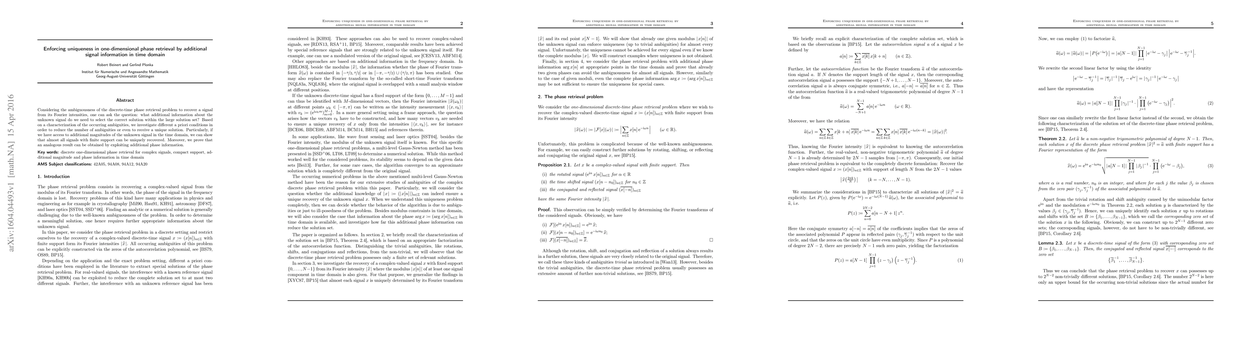 This paper explores how additional signal information in the time domain can enforce uniqueness in one-dimensional phase retrieval, addressing the inherent ambiguity in recovering a signal from its Fourier intensities. It demonstrates that with extra magnitudes or phase information, almost all signals with finite support can be uniquely identified.