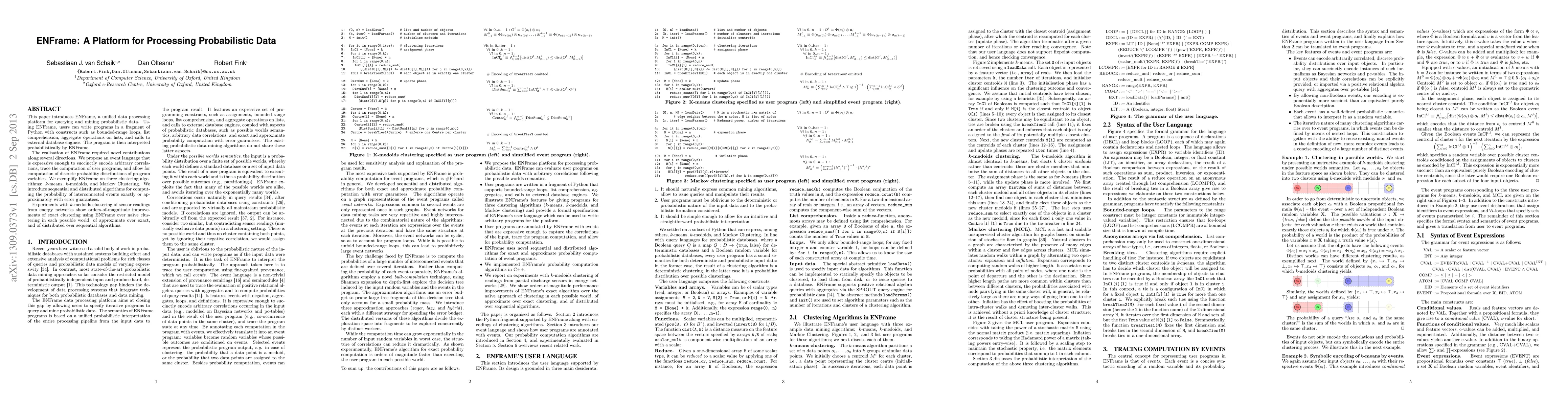 This paper introduces ENFrame, a unified data processing platform for querying and mining probabilistic data. Using ENFrame, users can write programs in a fragment of Python with constructs such as bounded-range loops, list comprehension, aggregate operations on lists, and calls to external database engines. The program is then interpreted probabilistically by ENFrame. The realisation of ENFrame required novel contributions along several directions. We propose an event language that is expressive enough to succinctly encode arbitrary correlations, trace the computation of user programs, and allow for computation of discrete probability distributions of program variables. We exemplify ENFrame on three clustering algorithms: k-means, k-medoids, and Markov Clustering. We introduce sequential and distributed algorithms for computing the probability of interconnected events exactly or approximately with error guarantees. Experiments with k-medoids clustering of sensor readings from energy networks show orders-of-magnitude improvements of exact clustering using ENFrame over na\"ive clustering in each possible world, of approximate over exact, and of distributed over sequential algorithms.