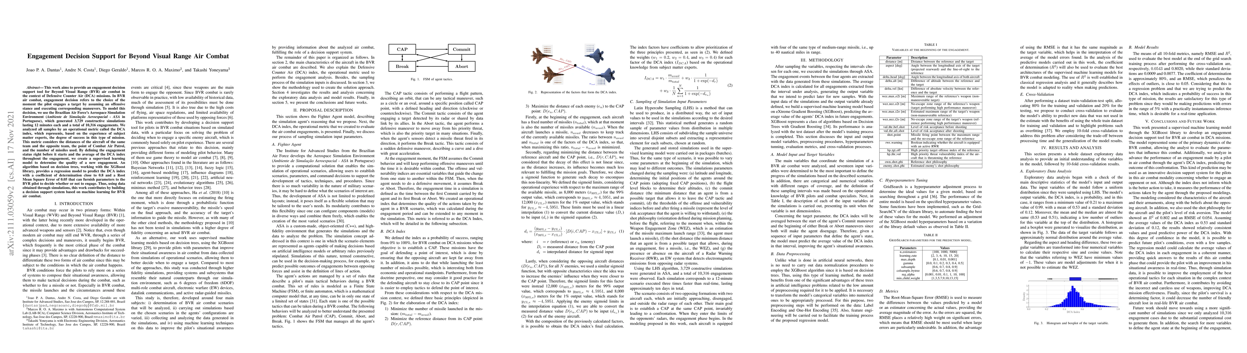 This paper develops a machine learning model to support engagement decisions in Beyond Visual Range (BVR) air combat, using simulations from the Brazilian Air Force's Aerospace Simulation Environment. The model predicts the success of engagements based on the Defensive Counter Air index, aiming to assist pilots in deciding whether to engage targets.