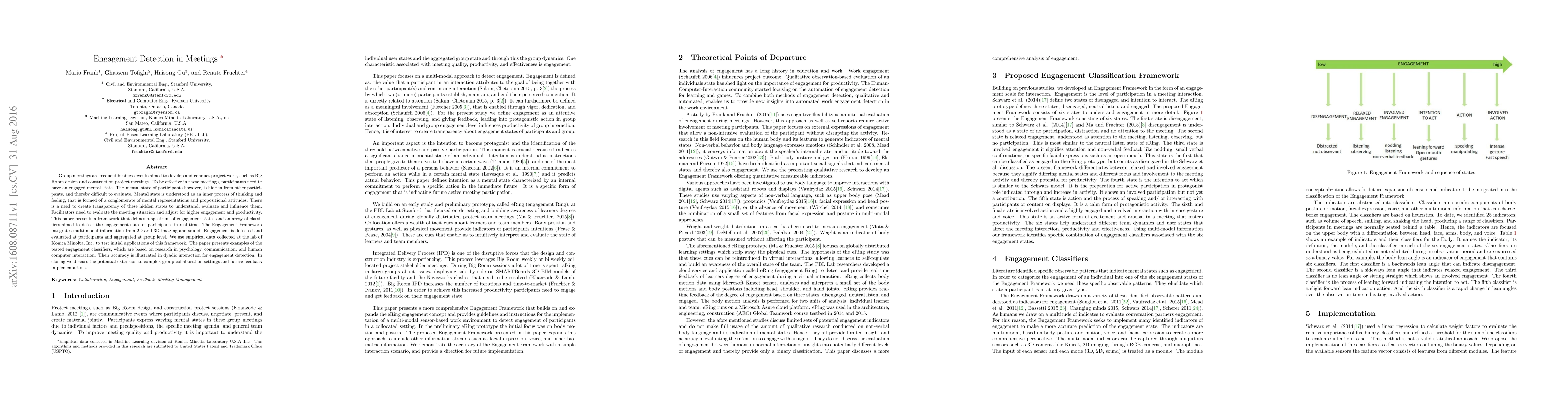 Group meetings are frequent business events aimed to develop and conduct project work, such as Big Room design and construction project meetings. To be effective in these meetings, participants need to have an engaged mental state. The mental state of participants however, is hidden from other participants, and thereby difficult to evaluate. Mental state is understood as an inner process of thinking and feeling, that is formed of a conglomerate of mental representations and propositional attitudes. There is a need to create transparency of these hidden states to understand, evaluate and influence them. Facilitators need to evaluate the meeting situation and adjust for higher engagement and productivity. This paper presents a framework that defines a spectrum of engagement states and an array of classifiers aimed to detect the engagement state of participants in real time. The Engagement Framework integrates multi-modal information from 2D and 3D imaging and sound. Engagement is detected and evaluated at participants and aggregated at group level. We use empirical data collected at the lab of Konica Minolta, Inc. to test initial applications of this framework. The paper presents examples of the tested engagement classifiers, which are based on research in psychology, communication, and human computer interaction. Their accuracy is illustrated in dyadic interaction for engagement detection. In closing we discuss the potential extension to complex group collaboration settings and future feedback implementations.