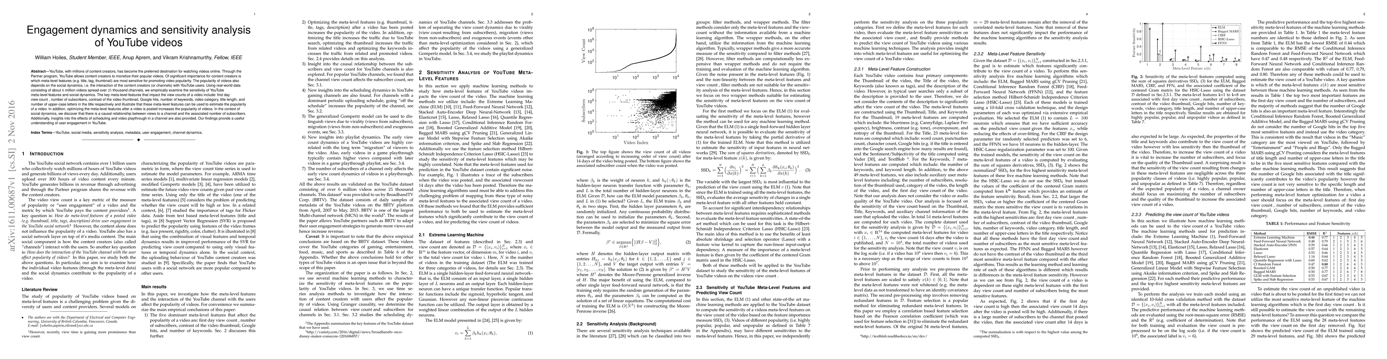 YouTube, with millions of content creators, has become the preferred destination for watching videos online. Through the Partner program, YouTube allows content creators to monetize their popular videos. Of significant importance for content creators is which meta-level features (e.g. title, tag, thumbnail) are most sensitive for promoting video popularity. The popularity of videos also depends on the social dynamics, i.e. the interaction of the content creators (or channels) with YouTube users. Using real-world data consisting of about 6 million videos spread over 25 thousand channels, we empirically examine the sensitivity of YouTube meta-level features and social dynamics. The key meta-level features that impact the view counts of a video include: first day view count , number of subscribers, contrast of the video thumbnail, Google hits, number of keywords, video category, title length, and number of upper-case letters in the title respectively and illustrate that these meta-level features can be used to estimate the popularity of a video. In addition, optimizing the meta-level features after a video is posted increases the popularity of videos. In the context of social dynamics, we discover that there is a causal relationship between views to a channel and the associated number of subscribers. Additionally, insights into the effects of scheduling and video playthrough in a channel are also provided. Our findings provide a useful understanding of user engagement in YouTube.
