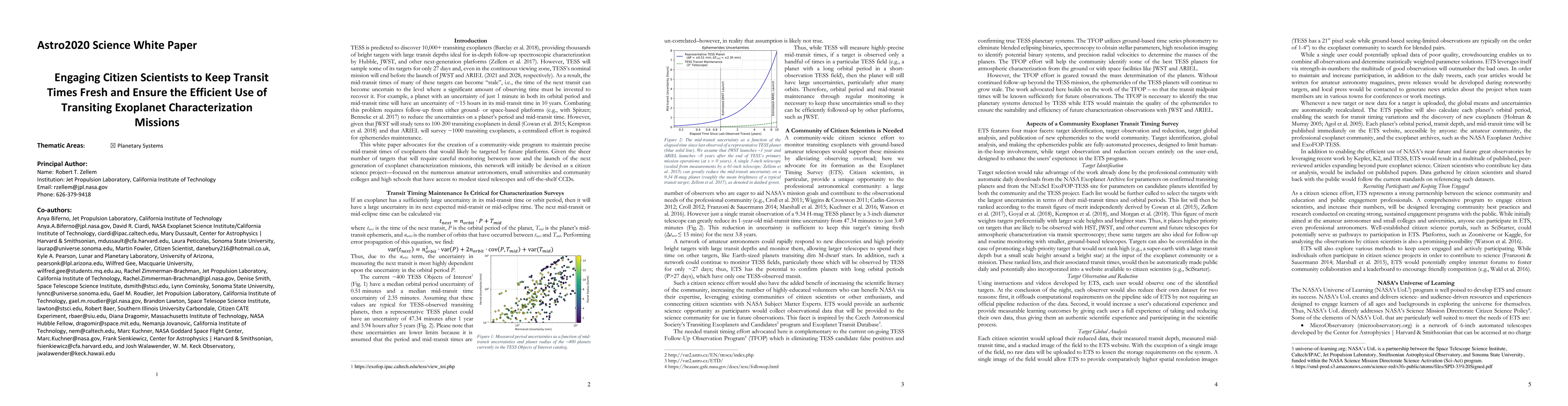 This white paper advocates for the creation of a community-wide program to maintain precise mid-transit times of exoplanets that would likely be targeted by future platforms. Given the sheer number of targets that will require careful monitoring between now and the launch of the next generation of exoplanet characterization missions, this network will initially be devised as a citizen science project -- focused on the numerous amateur astronomers, small universities and community colleges and high schools that have access to modest sized telescopes and off-the-shelf CCDs.