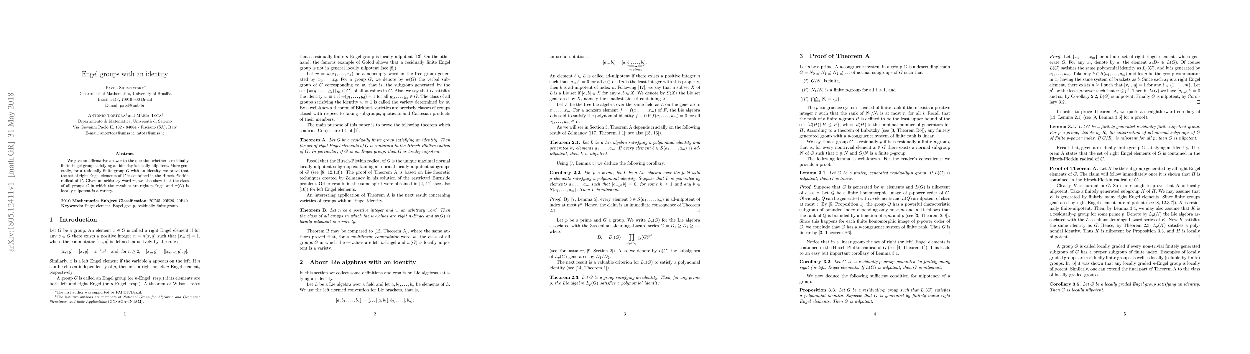 Summary: This paper proves that residually finite Engel groups satisfying an identity are locally nilpotent. It also demonstrates that right Engel elements in residually finite groups are part of the Hirsch-Plotkin radical and establishes that groups with specific properties defined by arbitrary words form a variety.