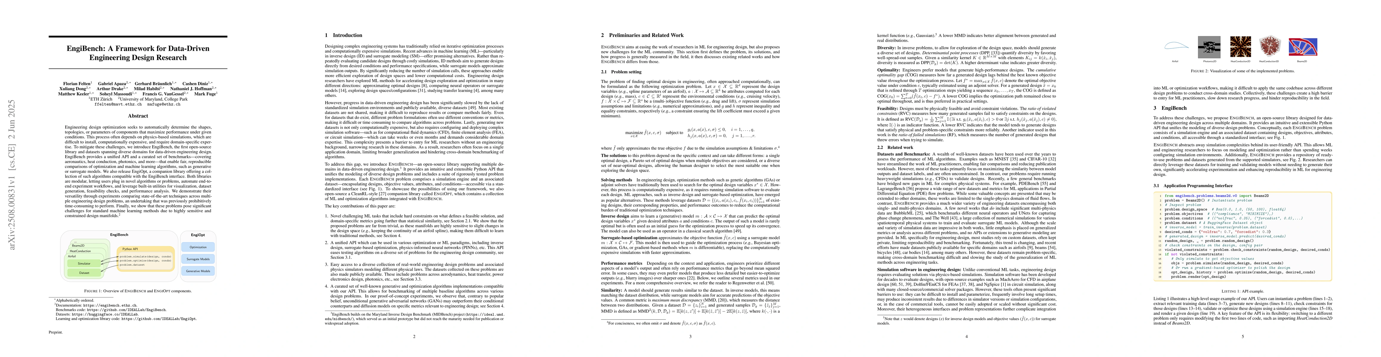 Engineering design optimization seeks to automatically determine the shapes, topologies, or parameters of components that maximize performance under given conditions. This process often depends on physics-based simulations, which are difficult to install, computationally expensive, and require domain-specific expertise. To mitigate these challenges, we introduce EngiBench, the first open-source library and datasets spanning diverse domains for data-driven engineering design. EngiBench provides a unified API and a curated set of benchmarks -- covering aeronautics, heat conduction, photonics, and more -- that enable fair, reproducible comparisons of optimization and machine learning algorithms, such as generative or surrogate models. We also release EngiOpt, a companion library offering a collection of such algorithms compatible with the EngiBench interface. Both libraries are modular, letting users plug in novel algorithms or problems, automate end-to-end experiment workflows, and leverage built-in utilities for visualization, dataset generation, feasibility checks, and performance analysis. We demonstrate their versatility through experiments comparing state-of-the-art techniques across multiple engineering design problems, an undertaking that was previously prohibitively time-consuming to perform. Finally, we show that these problems pose significant challenges for standard machine learning methods due to highly sensitive and constrained design manifolds.