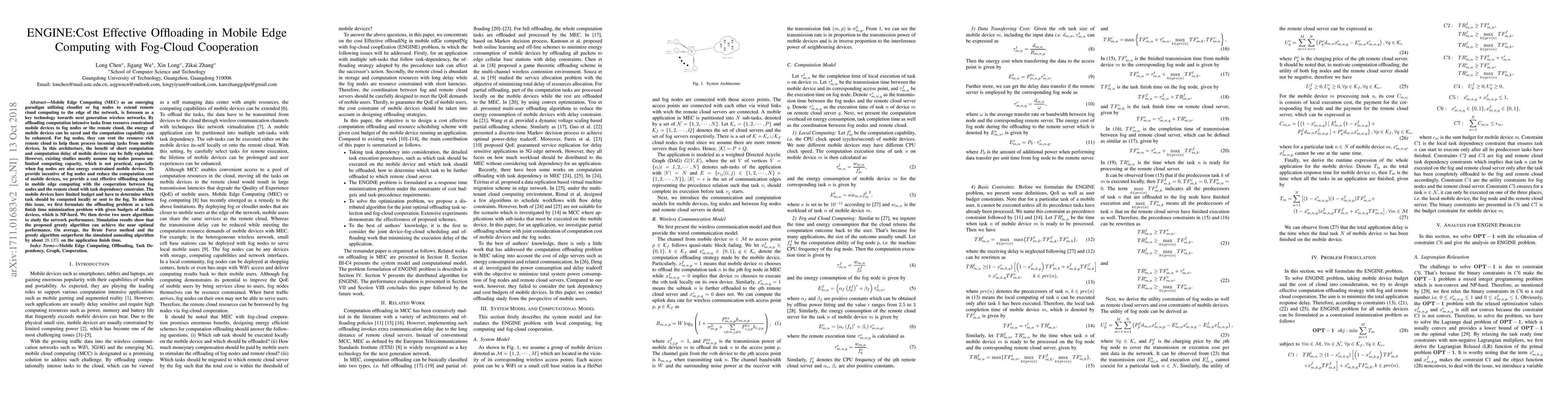 This paper proposes a cost-effective offloading scheme in mobile edge computing that leverages the cooperation between fog nodes and the remote cloud to optimize task completion times within mobile device budgets. The authors formulate the offloading problem as an NP-hard task finish time minimization problem and develop algorithms to achieve near-optimal performance, demonstrating significant improvements over simulated annealing methods.