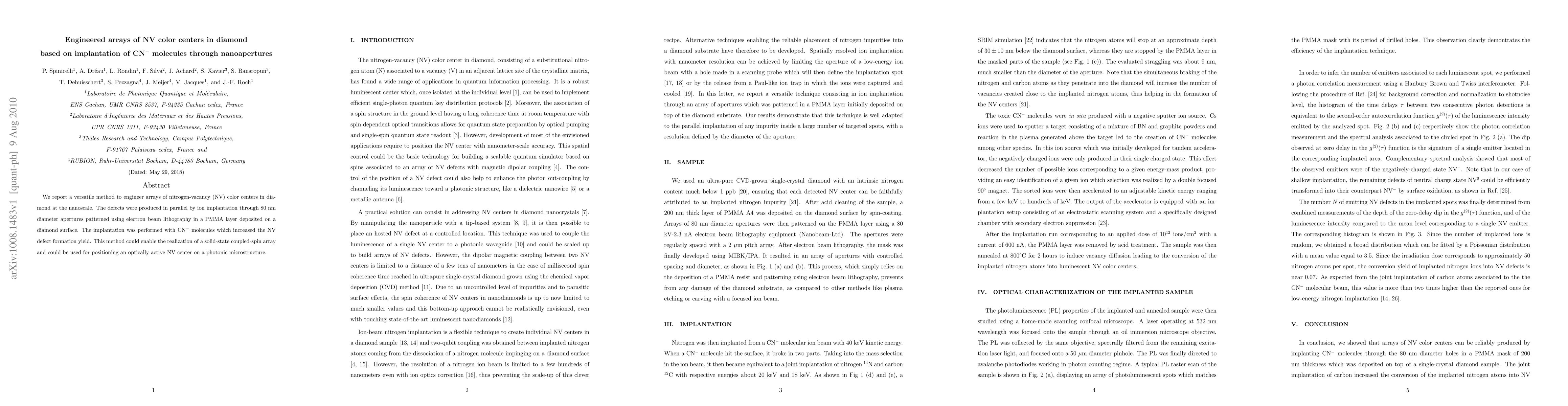 This paper presents a method for creating nanoscale arrays of nitrogen-vacancy (NV) color centers in diamond using ion implantation through nanoapertures, with CN- molecules enhancing defect formation. The technique could facilitate the development of coupled-spin arrays and precise positioning of NV centers for photonic applications.
