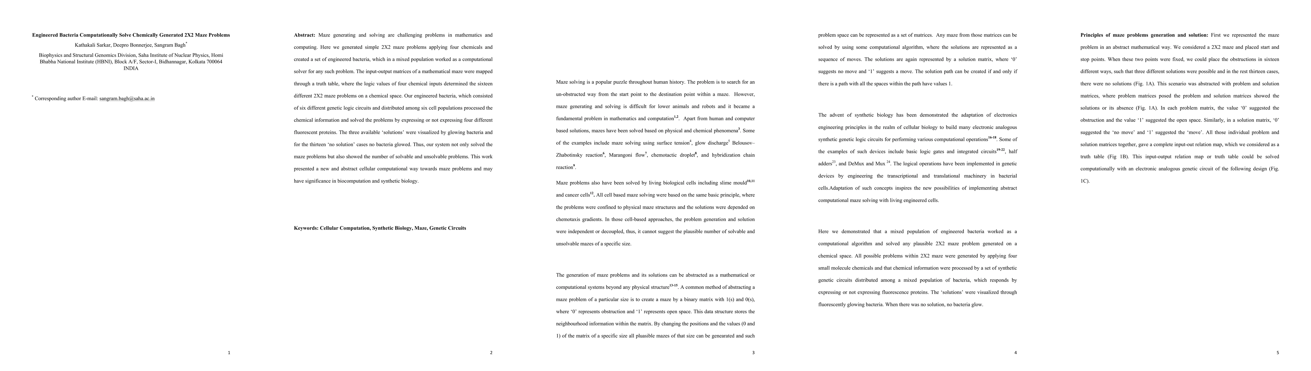 This research paper details the development of engineered bacteria that computationally solve 2x2 maze problems generated by chemical inputs. These bacteria, with distributed genetic logic circuits, process chemical signals to determine the maze's solvability, visually indicating solutions through fluorescence.