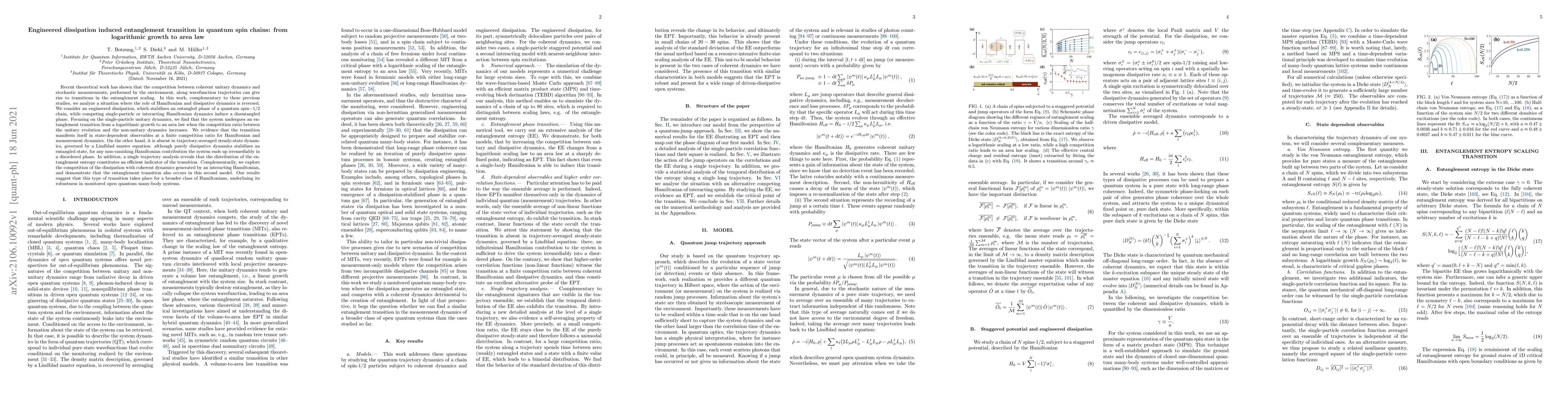 This paper investigates how engineered dissipation can stabilize an entangled phase in quantum spin chains while competing Hamiltonian dynamics lead to disentanglement. The study finds an entanglement transition from logarithmic growth to an area law as the competition between unitary and non-unitary dynamics increases, with implications for state-dependent observables but not for trajectory-averaged steady states.