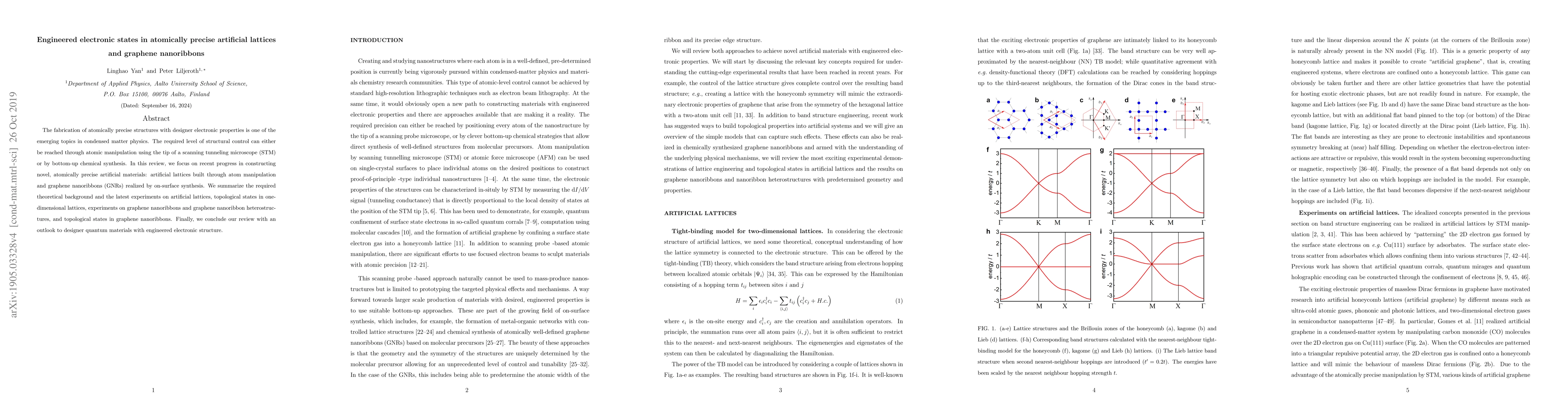The fabrication of atomically precise structures with designer electronic properties is one of the emerging topics in condensed matter physics. The required level of structural control can either be reached through atomic manipulation using the tip of a scanning tunneling microscope (STM) or by bottom-up chemical synthesis. In this review, we focus on recent progress in constructing novel, atomically precise artificial materials: artificial lattices built through atom manipulation and graphene nanoribbons (GNRs) realized by on-surface synthesis. We summarize the required theoretical background and the latest experiments on artificial lattices, topological states in one-dimensional lattices, experiments on graphene nanoribbons and graphene nanoribbon heterostructures, and topological states in graphene nanoribbons. Finally, we conclude our review with an outlook to designer quantum materials with engineered electronic structure.
