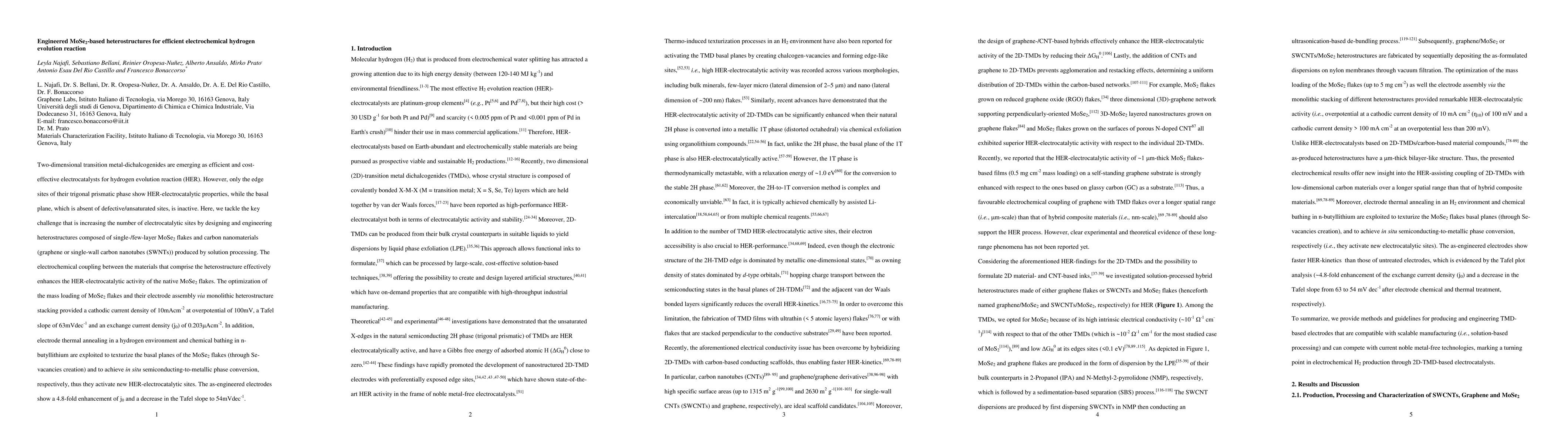 This paper presents engineered MoSe2-based heterostructures combining MoSe2 flakes with carbon nanomaterials to enhance the electrochemical hydrogen evolution reaction (HER). The heterostructures significantly boost HER activity by creating new catalytic sites through material optimization and thermal/chemical treatments.