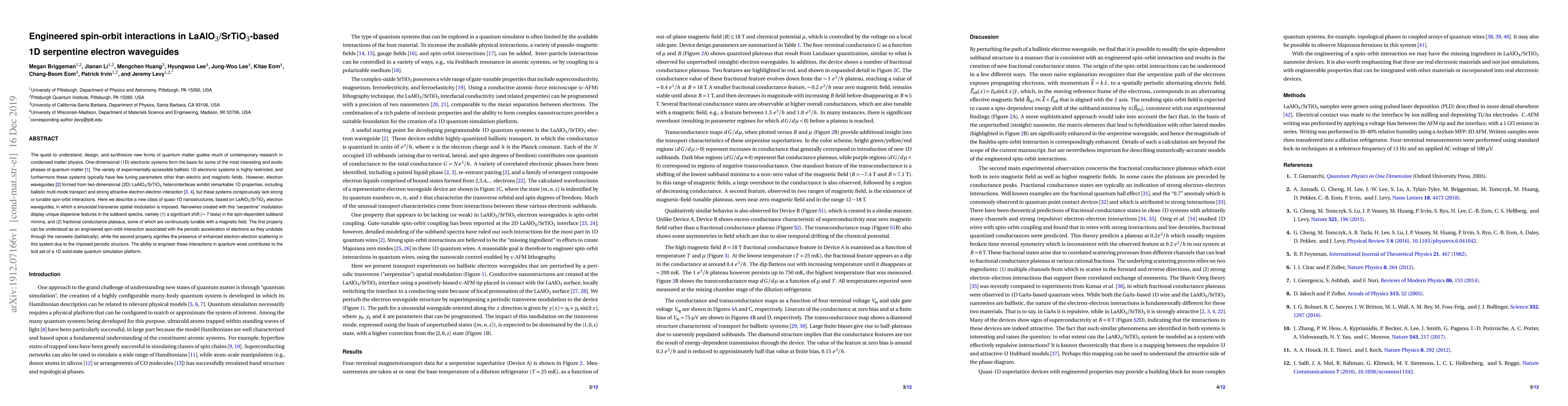 The quest to understand, design, and synthesize new forms of quantum matter guides much of contemporary research in condensed matter physics. One-dimensional (1D) electronic systems form the basis for some of the most interesting and exotic phases of quantum matter. The variety of experimentally-accessible ballistic 1D electronic systems is highly restricted, and furthermore these systems typically have few tuning parameters other than electric and magnetic fields. However, electron waveguides formed from two-dimensional (2D) LaAlO$_3$/SrTiO$_3$ heterointerfaces exhibit remarkable 1D properties, including ballistic multi-mode transport and strong attractive electron-electron interaction, but these systems conspicuously lack strong or tunable spin-orbit interactions. Here we describe a new class of quasi-1D nanostructures, based on LaAlO$_3$/SrTiO$_3$ electron waveguides, in which a sinusoidal transverse spatial modulation is imposed. Nanowires created with this "serpentine" modulation display unique dispersive features in the subband spectra, namely (1) a significant shift ($\sim$ 7 tesla) in the spin-dependent subband minima, and (2) fractional conductance plateaus, some of which are continuously tunable with a magnetic field. The first property can be understood as an engineered spin-orbit interaction associated with the periodic acceleration of electrons as they undulate through the nanowire (ballistically), while the second property signifies the presence of enhanced electron-electron scattering in this system due to the imposed periodic structure. The ability to engineer these interactions in quantum wires contributes to the tool set of a 1D solid-state quantum simulation platform.