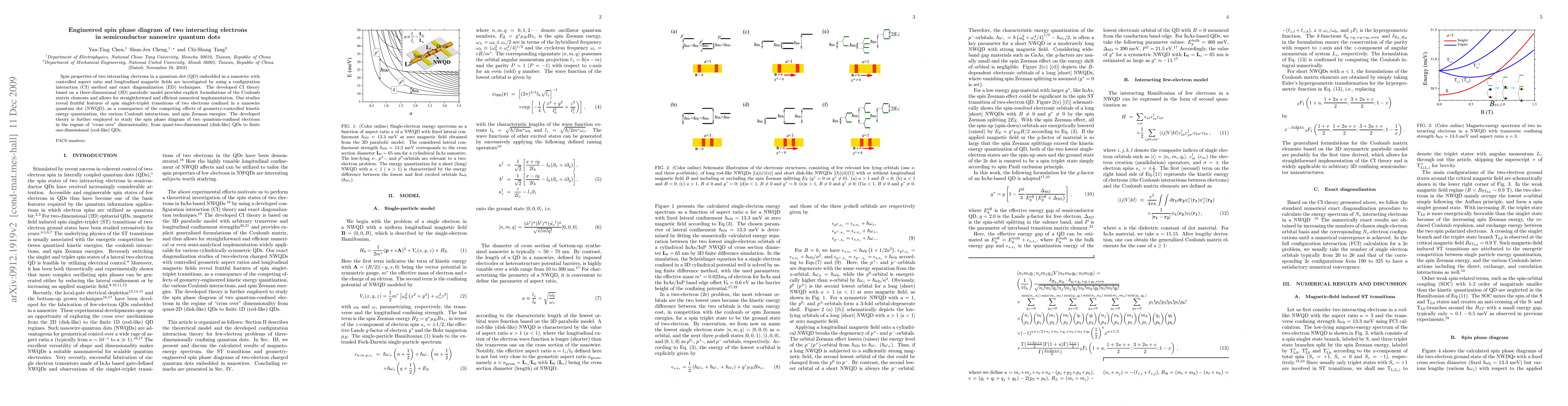 Researchers studied spin properties of two interacting electrons in semiconductor nanowire quantum dots using a new theory, revealing transitions between singlet and triplet states due to geometry and Coulomb interactions.