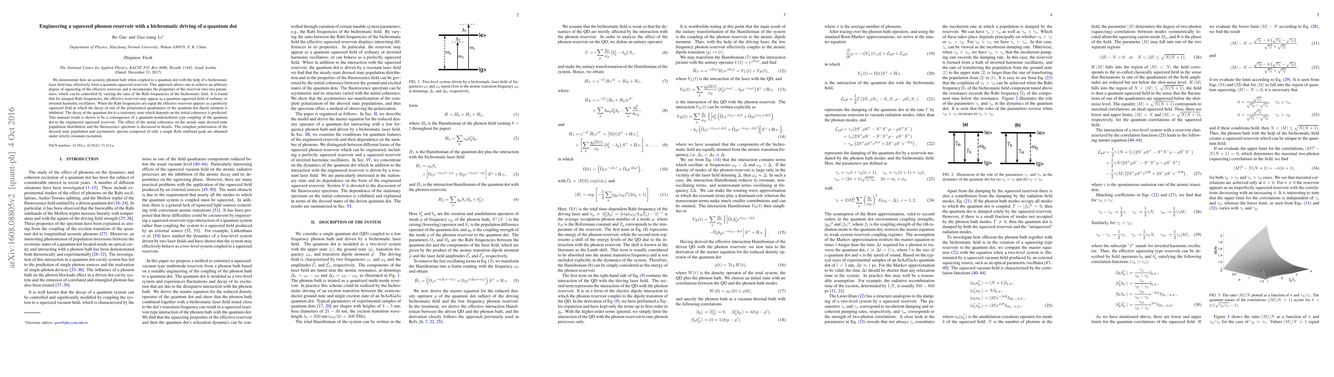 This paper demonstrates the creation of a squeezed phonon reservoir by coupling an acoustic phonon bath to a quantum dot via a bichromatic laser field, achieving tunable squeezing controlled by the ratio of the laser's Rabi frequencies. The study reveals that the reservoir can exhibit quantum squeezed fields and predicts the quantum dot's decay to a stationary state influenced by initial coherence, with implications for dressed-state populations and fluorescence spectra.