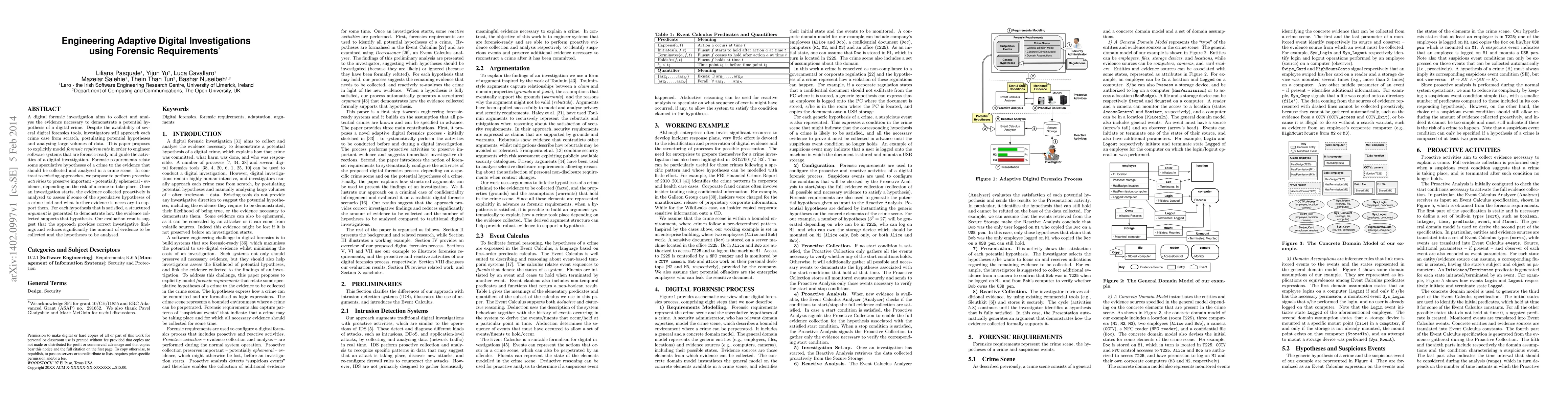 This paper proposes a method to model forensic requirements to engineer adaptive digital investigation tools that proactively preserve crucial evidence based on crime risk, thus reducing the amount of data to be analyzed and improving investigative findings. The approach generates structured arguments to support satisfied hypotheses, demonstrating its effectiveness in guiding digital investigations.