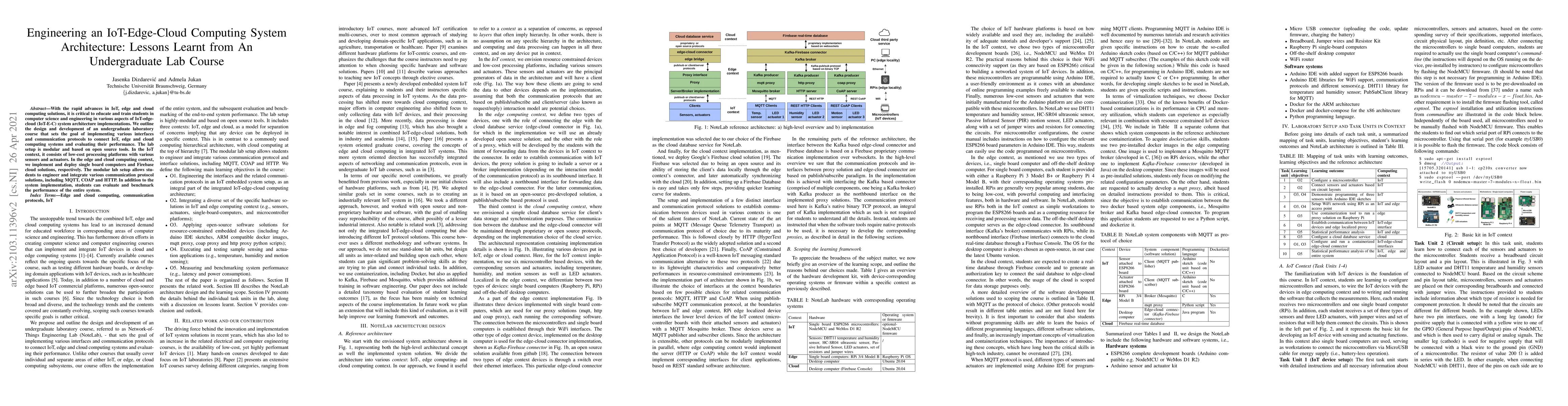 A research paper describes a lab course that teaches students to design and implement IoT-edge-cloud systems using open-source tools, with a focus on modular communication protocol integration and performance evaluation.