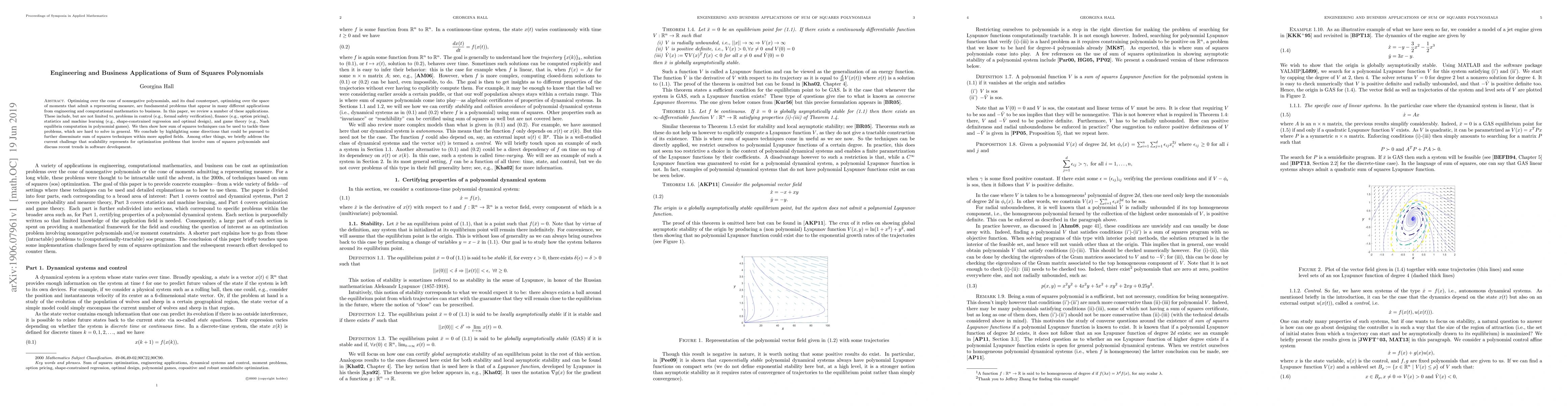 This paper reviews applications of sum of squares polynomials in engineering, business, and computational mathematics, including control, finance, statistics, and game theory. It demonstrates the utility of sum of squares techniques in solving complex optimization problems and discusses scalability challenges and recent software developments.