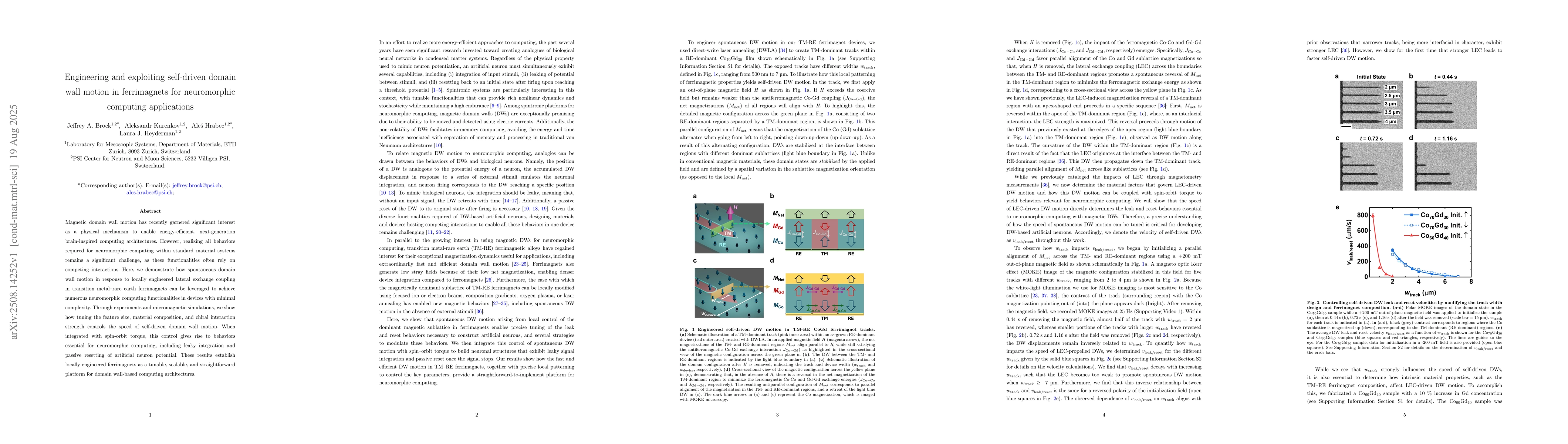 Magnetic domain wall motion has recently garnered significant interest as a physical mechanism to enable energy-efficient, next-generation brain-inspired computing architectures. However, realizing all behaviors required for neuromorphic computing within standard material systems remains a significant challenge, as these functionalities often rely on competing interactions. Here, we demonstrate how spontaneous domain wall motion in response to locally engineered lateral exchange coupling in transition metal-rare earth ferrimagnets can be leveraged to achieve numerous neuromorphic computing functionalities in devices with minimal complexity. Through experiments and micromagnetic simulations, we show how tuning the feature size, material composition, and chiral interaction strength controls the speed of self-driven domain wall motion. When integrated with spin-orbit torque, this control gives rise to behaviors essential for neuromorphic computing, including leaky integration and passive resetting of artificial neuron potential. These results establish locally engineered ferrimagnets as a tunable, scalable, and straightforward platform for domain wall-based computing architectures.