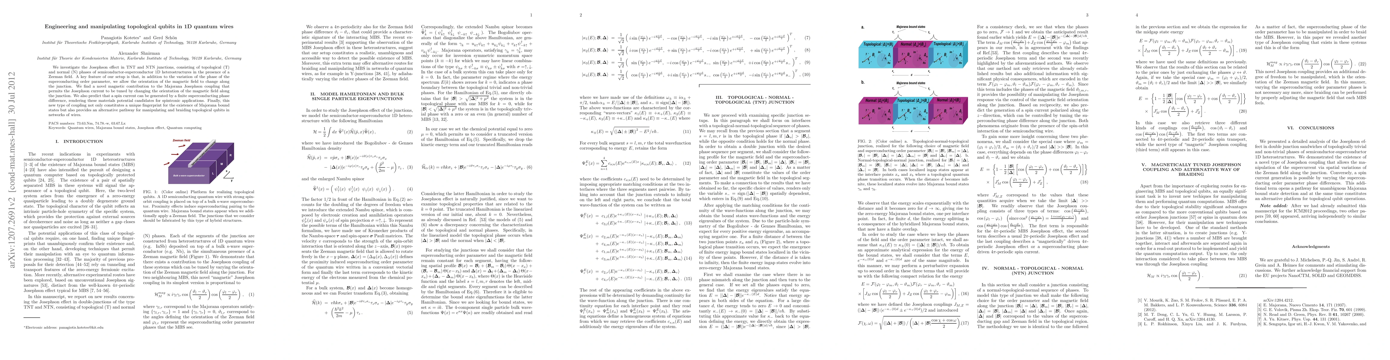 We investigate the Josephson effect in TNT and NTN junctions, consisting of topological (T) and normal (N) phases of semiconductor-superconductor 1D heterostructures in the presence of a Zeeman field. A key feature of our setup is that, in addition to the variation of the phase of the superconducting order parameter, we allow the orientation of the magnetic field to change along the junction. We find a novel magnetic contribution to the Majorana Josephson coupling that permits the Josephson current to be tuned by changing the orientation of the magnetic field along the junction. We also predict that a spin current can be generated by a finite superconducting phase difference, rendering these materials potential candidates for spintronic applications. Finally, this new type of coupling not only constitutes a unique fingerprint for the existence of Majorana bound states but also provides an alternative pathway for manipulating and braiding topological qubits in networks of wires.