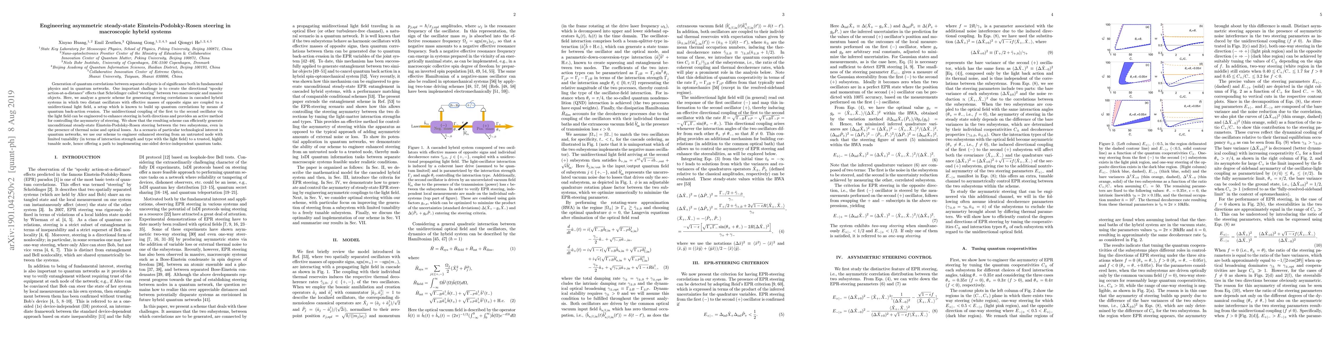 This paper proposes a method to generate asymmetric steady-state Einstein-Podolsky-Rosen steering in macroscopic hybrid systems by coupling two distant oscillators with opposite effective masses to a unidirectional light field, achieving efficient quantum correlations despite thermal noise and optical losses. The scheme enhances steering control and enables one-sided device-independent quantum tasks.