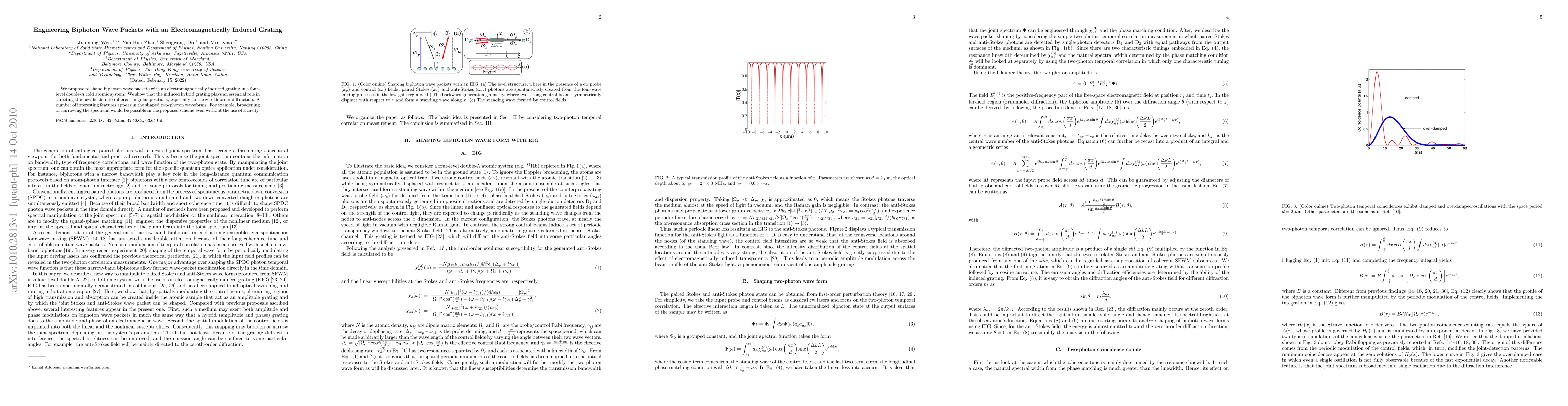 We propose to shape biphoton wave packets with an electromagnetically induced grating in a four-level double-$\Lambda$ cold atomic system. We show that the induced hybrid grating plays an essential role in directing the new fields into different angular positions, especially to the zeroth-order diffraction. A number of interesting features appear in the shaped two-photon waveforms. For example, broadening or narrowing the spectrum would be possible in the proposed scheme even without the use of a cavity.