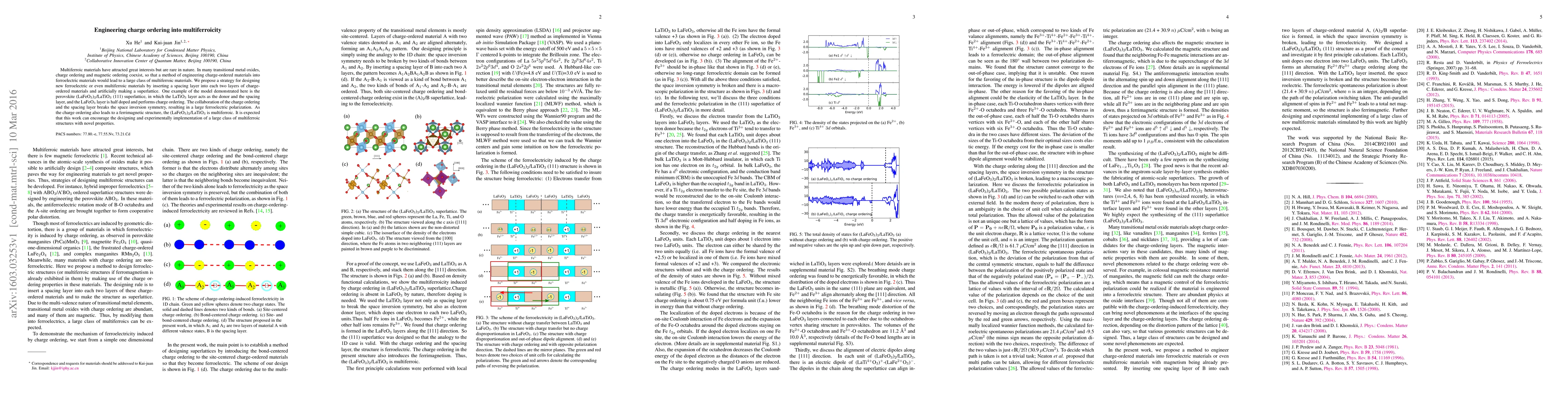 Multiferroic materials have attracted great interests but are rare in nature. In many transitional metal oxides, charge ordering and magnetic ordering coexist, so that a method of engineering charge-ordered materials into ferroelectric materials would lead to a large class of multiferroic materials. We propose a strategy for designing new ferroelectric or even multiferroic materials by inserting a spacing layer into each two layers of charge-ordered materials and artificially making a superlattice. One example of the model demonstrated here is the perovskite (LaFeO$_3$)$_2$/LaTiO$_3$ (111) superlattice, in which the LaTiO$_3$ layer acts as the donor and the spacing layer, and the LaFeO$_3$ layer is half doped and performs charge ordering. The collaboration of the charge ordering and the spacing layer breaks the space inversion symmetry, resulting in a large ferroelectric polarization. As the charge ordering also leads to a ferrimagnetic structure, the (LaFeO$_3$)$_2$/LaTiO$_3$ is multiferroic. It is expected that this work can encourage the designing and experimentally implementation of a large class of multiferroic structures with novel properties.
